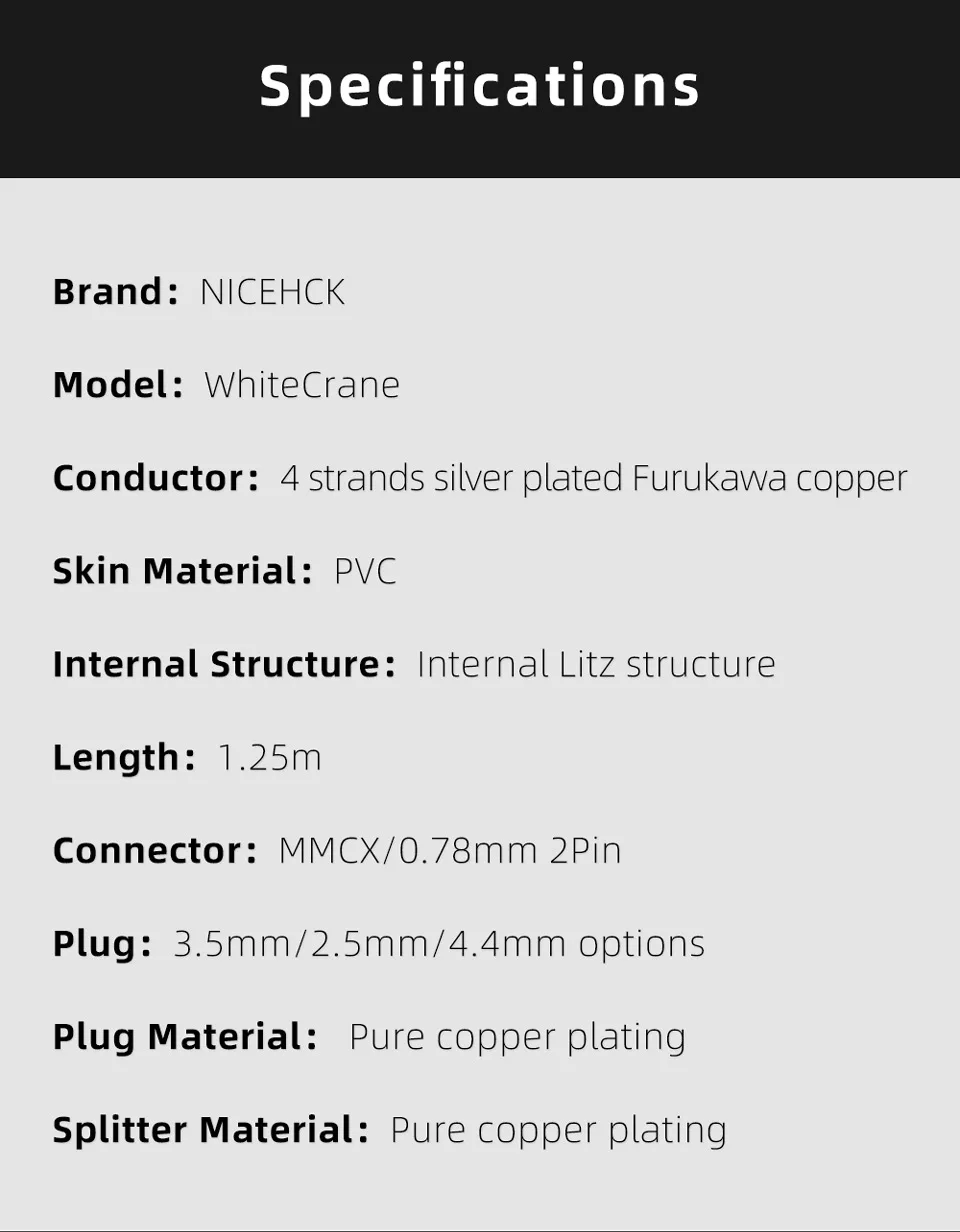 1. Название продукта:NICEHCK WhiteCrane высокое качество 4 Core с серебряным покрытием Furukawa Медь кабель 2. Бренд:Ницех 3. Модель:Белый цвет 4. Проводник:4 нити посеребренные Furukawa медь 5. Количество ядер:0,06 мм * 140 каждая нить 6. Материал кожи: ПВХ 7. Внутренняя структура: Внутренняя Litz структура 8. Звуковые характеристики: Улучшенная производительность средней частоты 9. Длина: 1,25 м ± 3 см 10. Процесс вязания: перекрестное вязание 11. Тип вилки:3,5/2,5/4,4 мм прямой варианты штепсельных 12. Разъем:MMCX. 0,78 мм 2Pin 13. Материал вилки: покрытие из чистой меди 14. Материал сплиттера: покрытие из чистой меди 15. Товар содержит:Кабель NICEHCK * 1 шт. (наушники в комплект не входят) 16. Использование для 1. Разъем MMCX: Заново X-One/U1 Shuore TAPE/S10/H27 Yincrow RW-2000/RW-1000 FiiO FD5/FH7/FH5/FH3/FA9/FA7 TINHIFI P1/ T2/T2 Pro/T2 plus/T3/T4 Smabat BlackBat/ST-10S/ST10/M1/M1 Pro/M2 Pro LZ A7/A2/A2s/A3/A3s/A4/A5/A6/A6 Mini/Z04A/Z05A NICEHCK EBX21/EBX/M6/N3/P3/DT600/DT500/DT300 SENFER MT300/DT6/DT6Pro/KP580/KP520/KP330/KP110/KP120/KP330/PT15/PT25/PT2021/TONEKINGLUCIFER/Ye/TO600/TO400s/TO200/TO180/TO65/TS5/TY2/единорог/EA/1Q/V10/P10/BL1/Shockwave III/T5/ T3/ TK16S/T6/T88K/T4/Dendroaspis ViridisИ так далее MMCX разъем наушников Универсальный. 2. 0,78 мм 2Pin разъем: Подходит для CIEM Шуоер дирижер/певец/солист/EJ07/Tape Pro KZ BA10/AS10/ZS10/ZSR/ZST/ED12/ES3/ES4 KZ ZS10/ZS10 Pro/ZSN ProX/ZST/ZSTx KZ ZSX/ZAX/ASF/ASX/EDX/AS16/AS12/AS10/AS06/BA10 CCA CA4/C10/C12/C16/TRNBA5/V90/V10/V20/V30/V60/V80/IM1/IM2/X6 NICEHCK F3/NX7/NX7PRO/NX7MK3/DB3/NK10/FR12/SP12 FiiO FD1/ FH1s /Dunu/ Shanling/ OSTRY/ NFAUDIO/ MOONDROP/ TANCHJIM/ IKKO/ SHOZY/ SIMGOT/ TINHIFI/ TFZ/ AUGLAMOUR/ BQEYZ/ KINERA/ QOA BGVP/reytao/max TONEKING/LUCIFER/Ye/TO600/TO400s/TO200/TO180/TO65/ZFRE1/TS5/TY2/UNICORN/EA/1Q/V10/P10/BL1/Shockwave III/T5/ T3/ TK16S/T6/T88K/T4/Dendroaspis ViridisИ так далее 2pin разъем наушников Универсальный.