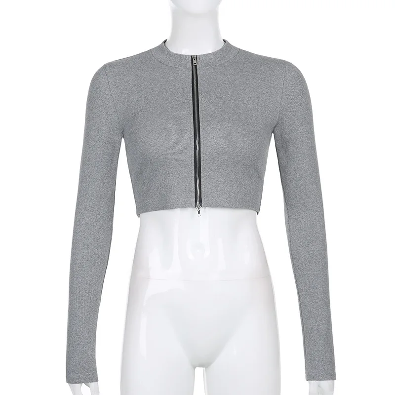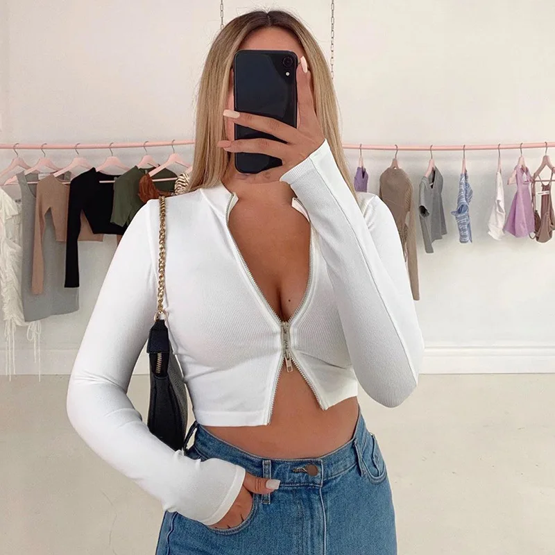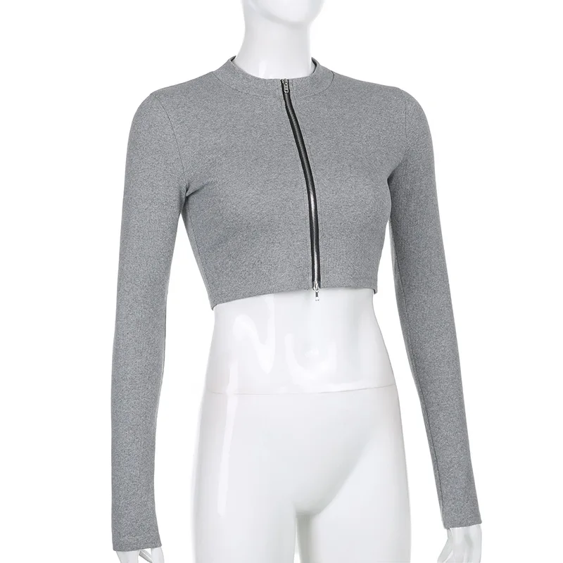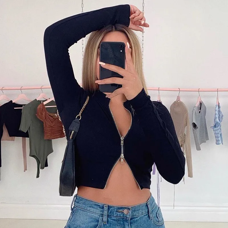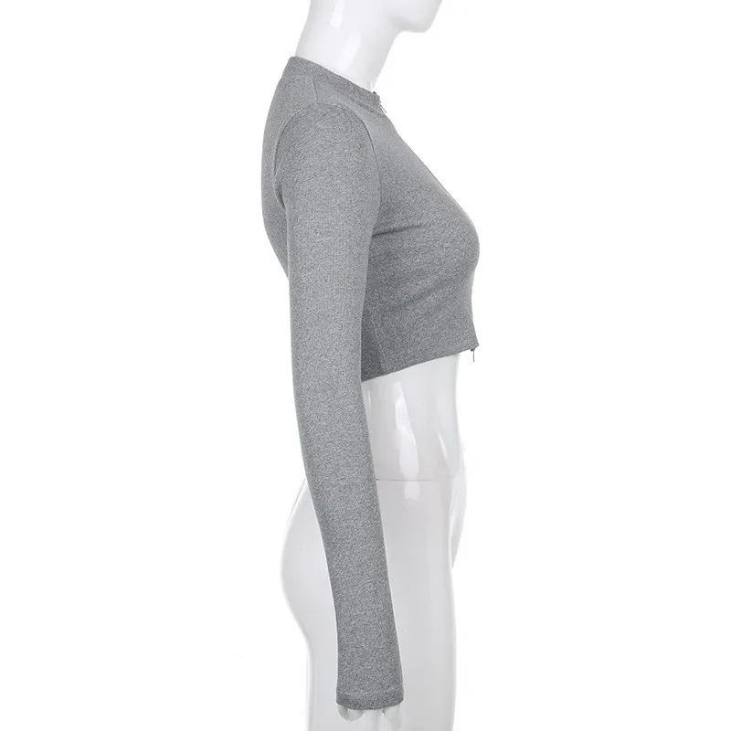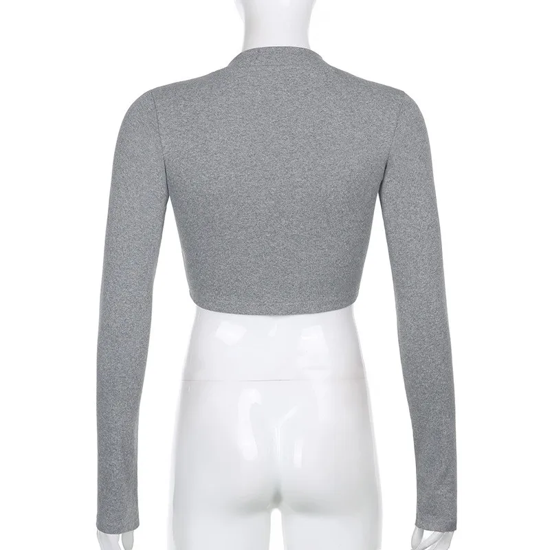 Hirigin, пикантные Топы в рубчик с двойной молнией, женские повседневные футболки с длинным рукавом, черные, белые, серые цвета, облегающие кроп-топы, футболки, Осенние