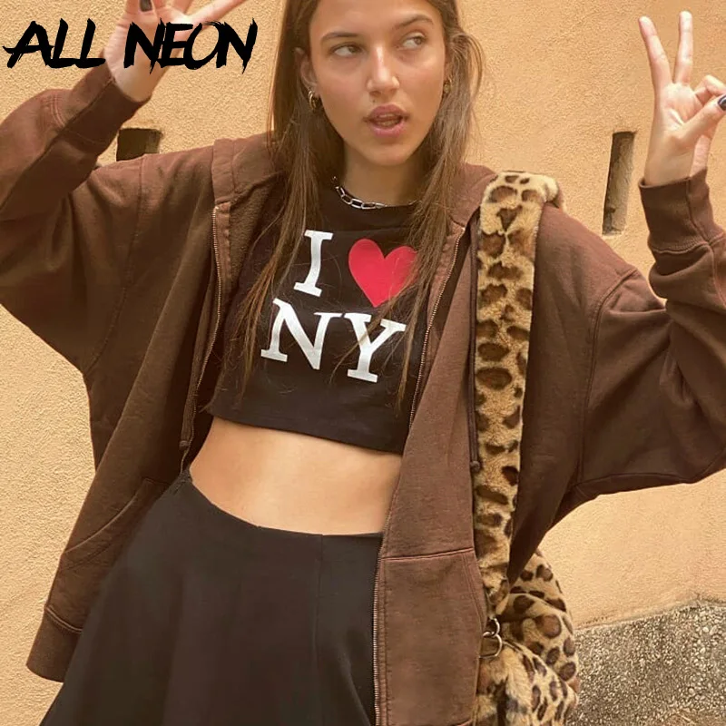 Толстовка ALLNeon Indie в винтажном стиле, Худи оверсайз с молнией спереди, Модный свитшот с длинным рукавом в стиле 90-х, коричневые свитшоты с карманами