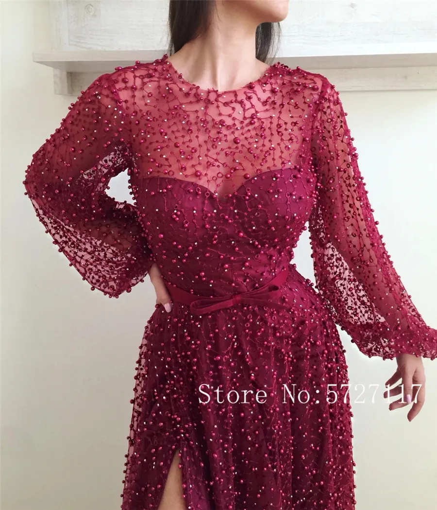 Платье для выпускного вечера, бордовое, с круглым вырезом и длинными рукавами, украшенное жемчугом, с разрезом спереди