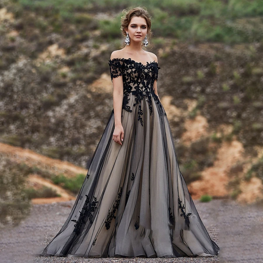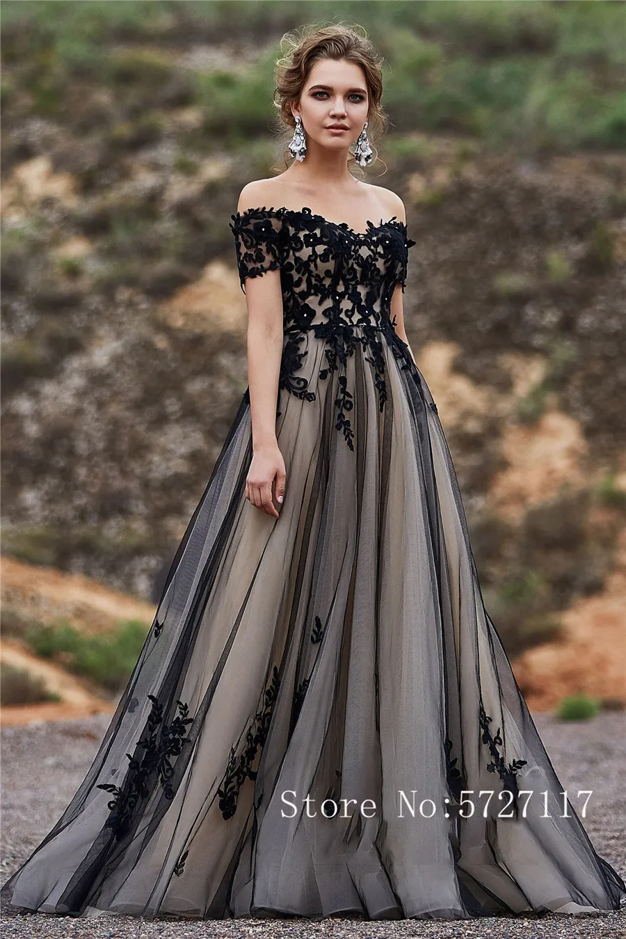 Платье Свадебное ТРАПЕЦИЕВИДНОЕ черное с открытыми плечами и кружевной аппликацией, со шлейфом