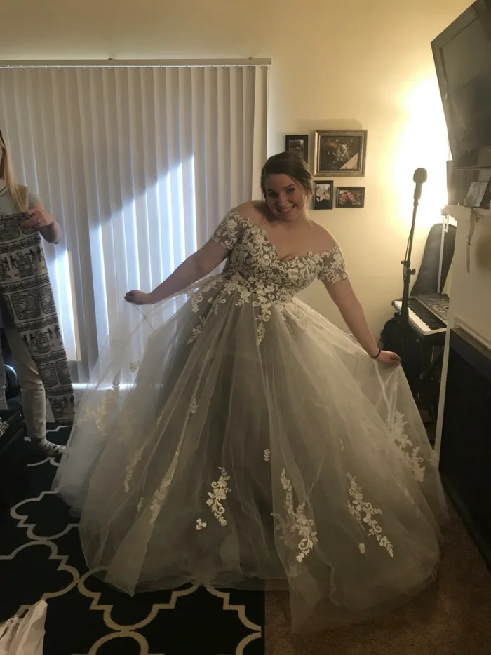 ЭТО ПЛАТЬЕ БЫЛО МЕЧТОЙ! Он был доставлен вовремя, был доставлен в красивой упаковке и доставил столько удовольствия моему бегству. Я отнес его к портному, и они добавили больше пуфа и немного восприняли его, и это было абсолютно идеально.