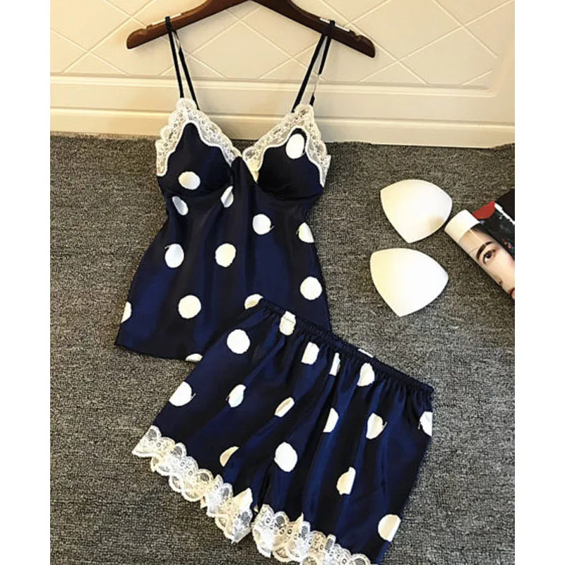 Новая женская пикантная одежда для сна, атласный кружевной пижамный комплект в горошек с глубоким V-образным вырезом, женское нижнее белье без рукавов, ночная рубашка, комбинация
