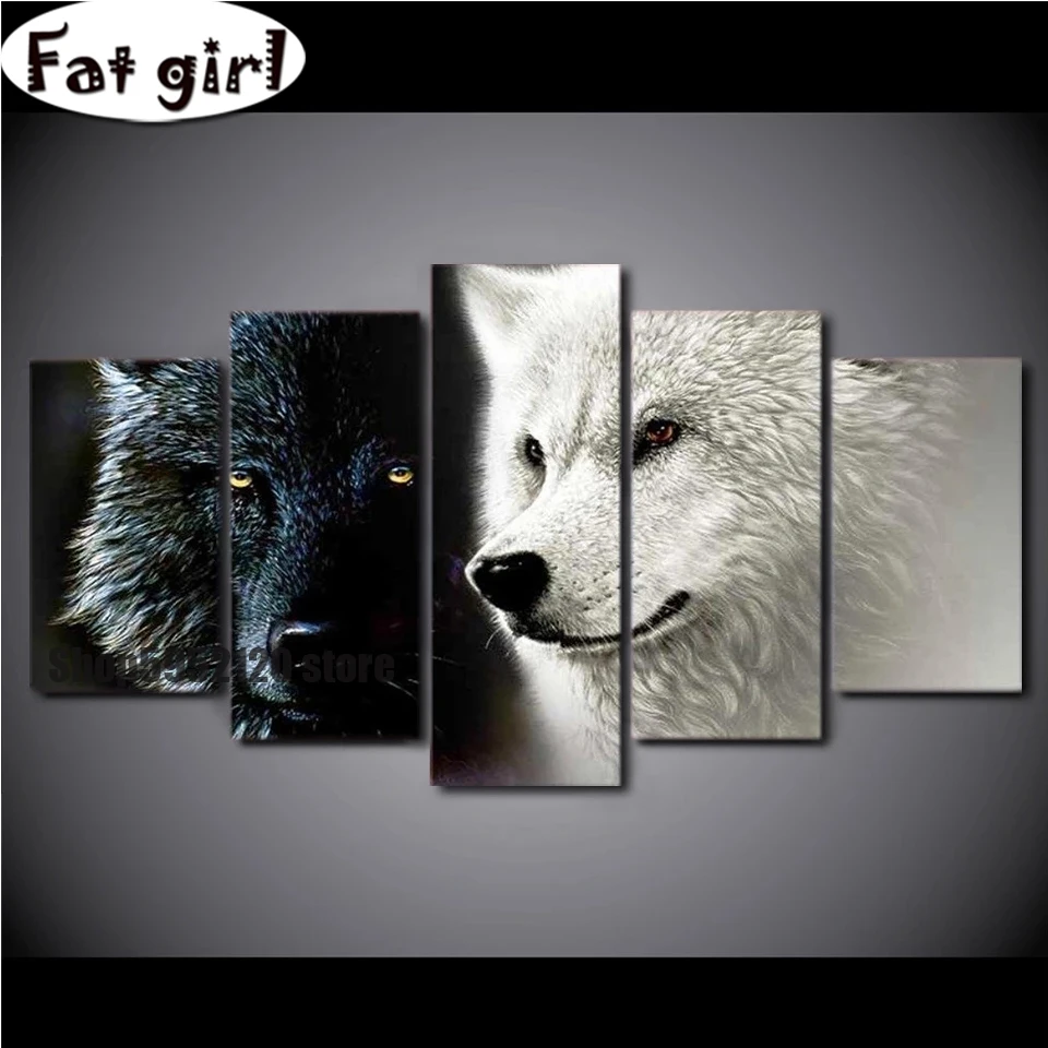 5 панельные настенные художественные животные Черный волк и Белый Волк Diy 5D алмазная картина квадратная круглая дрель вышивка крестиком Мозаика