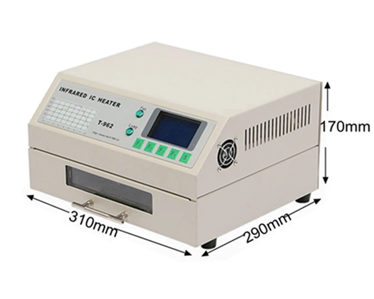 1. Инфракрасный IC обогреватель T962 является микропроцессором, контролируемым оплавлением. Он используется для эффективной пайки различных SMD и BGA компонентов. Весь процесс пайки может быть завершен автоматически, и он очень прост в использовании. В этой машине используется Мощный Инфракрасный поток горячего воздуха, поэтому температура остается очень точной и равномерно распределена.2. Оконный ящик предназначен для удержания рабочей части и обеспечивает безопасные методы пайки и манипулирование SMD/сумкой и другими маленькими электронными частями, установленными на сборке PCB. T962 может быть использован для автоматической переработы припоя для исправления плохих стыков припоя, удаления/замены плохих компонентов и завершения небольших инженерных моделей или прототипов.