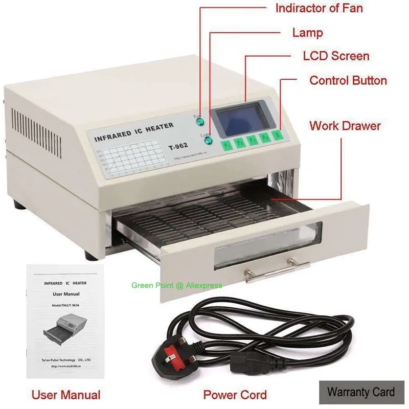 1 x инфракрасный IC НАГРЕВАТЕЛЬ T-962A1 х Кабель питания1 Предохранитель (110 В: 10 А; 220 В: 8 а)1 x Руководство пользователя (CD)