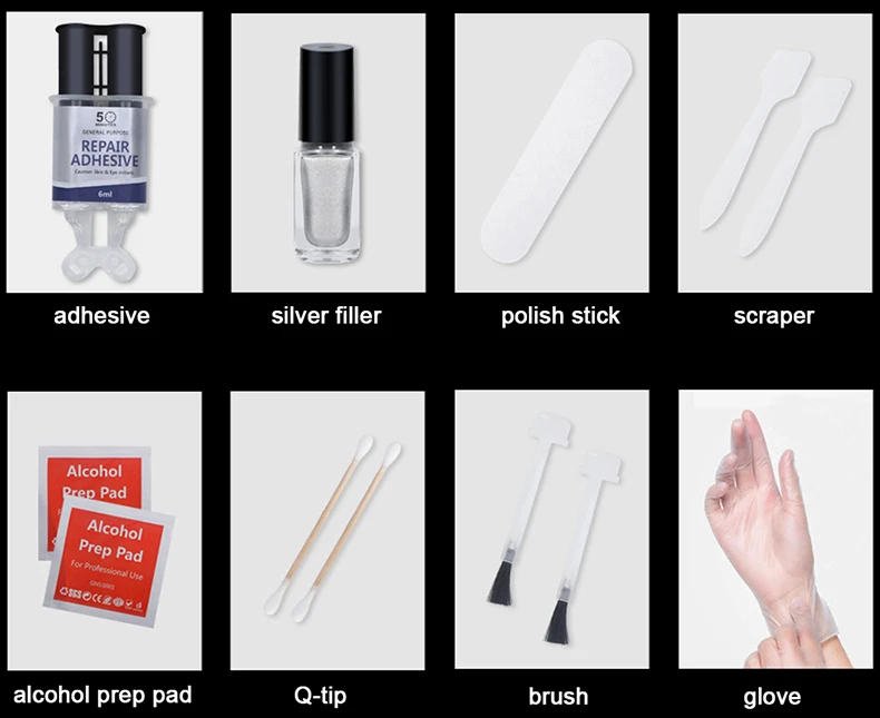 7. Используйте ватный тампон для очистки пролитого клея8. После того, как клей высохнет, нанесите серебряный порошок на поврежденную область, а затем подождите, пока серебряный порошок затвердеет