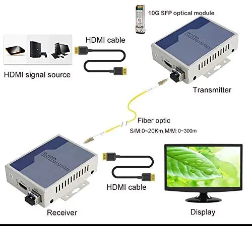 2. Передает сигналы HDMI на расстоянии до 10 км (6,2 миль) с помощью одного LC/LC siglemode Оптическое волокно кабеля. Совместимость с mutlimode волоконным кабелем, до 300 метров.