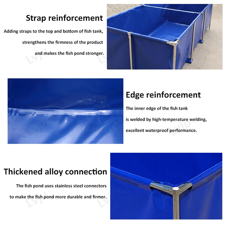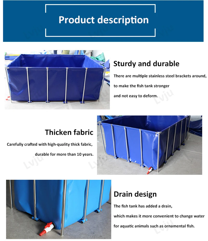 1. Прочный и долговечный Вокруг имеется несколько кронштейнов из нержавеющей стали, чтобы аквариум стал прочнее и его нелегко деформировать. 2. Плотная ткань Используйте экологически чистую плотную ткань 0,75 мм, нетоксичную, безвредную для рыбоводства, без запаха. Тщательно Изготовленная из высококачественной плотной ткани, прочная более 10 лет. 3. Дренажная конструкция В аквариум добавлен слив, что позволяет удобнее менять воду для водных животных, таких как декоративные рыбы. 4. Усиление ремешка Добавление ремешков к верху и дну аквариума, усиливает прочность продукта и делает пруд для рыб прочнее. 5. Усиление кромки Внутренний край аквариума сварен при высокой температуре, отличная водонепроницаемость. 6. Соединение из утолщенного сплава В пруду для рыб используются соединители из нержавеющей стали, чтобы сделать пруд для рыб более прочным и упругим. 7. Труба из нержавеющей стали Трубка из нержавеющей стали сварена в одну, а Т-образная колонна заменяет прочный и долговечный пластик. 8. Кронштейн из нержавеющей стали Рама изготовлена из толстостенных труб из нержавеющей стали, которая отличается прочностью и долговечностью.