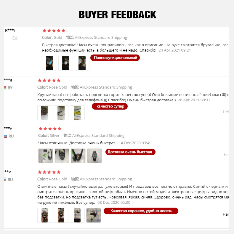 Посылка в Украину пришла за три недели на Новую почту, отслеживалась на всем пути. Запаковано хорошо, все пришло целое и невредимое. Часы смотрятся классно, они реально большие! Двойное время, дата, подсветка, секундомер, будильник- все работает. Имеется хронограф, но в нем пока не разобрался. Инструкция на английском и китайском языках, в подарок подставка-наклейка на телефон. Покупкой доволен, это уже третьи часы в данном магазине. С продавцом не общался.