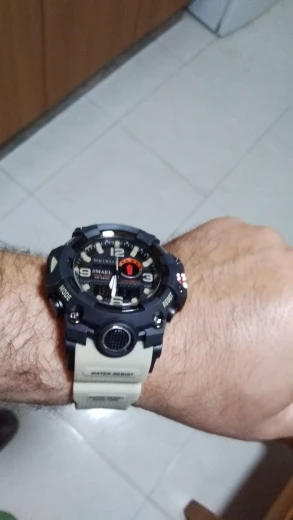 Легкие часы 72gr, большие и толстые (диаметр 52 мм 21 мм толщиной), пластиковый стеклянный протектор (стекло ниже протектора 1 '5 мм), прочный пластиковый резиновый ремешок. Функции аналоговые часы и. Цифровой; Дата, будильник и секундомер. Это водонепроницаемый; То есть он держит душ, дождь, погружение в несколько секунд, но никогда не касается кнопок в воде. Не используйте его для плавания или дайвинга. Это хорошие часы, Военный стиль с хорошим качеством цены. Рекомендуемая покупка.