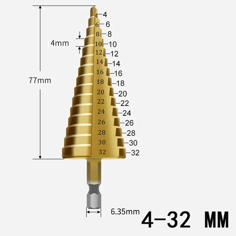 Особенности:Это новая быстрорежущая сталь с большим шаговым Конусным сверлом, титановый набор сверл, который сделан из высококачественной быстрорежущей стали и с титановым покрытием, чтобы уменьшить трение и теплоОн очень подходит для использования для резки отверстий из различных материалов, включая сталь, латунь, дерево, пластик и т. д.Материал: сталь HSSОтделка: ТитанДлина:4-12 мм Длина: прибл. 6,7 см/2,64"4-20 мм Длина: прибл. 7,4 см/2,91"4-32 мм Длина: прибл. 10,2 см/4,02"3 резца поставляются в следующих размерах:4-32 мм (4 мм, 6 мм, 8 мм, 10 мм, 12 мм, 14 мм, 16 мм, 18 мм, 20 мм, 22 мм, 24 мм, 26 мм, 28 мм, 30 мм, 2 мм)4-20 мм: 4 мм, 6 мм, 8 мм, 10 мм, 12 мм, 14 мм, 16 мм, 18 мм, 20 мм, 14 мм, 16 мм, 18 мм, 20 мм4-12 мм (4 мм, 6 мм, 8 мм, 10 мм, 2 мм)