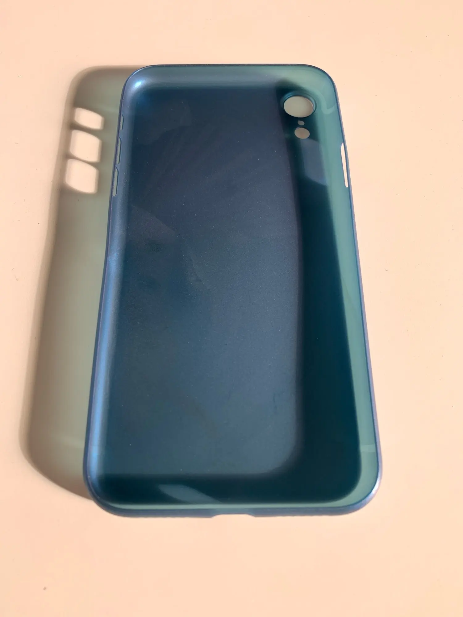 Белый матовый полупрозрачный, яблочко видно, и правда тончайший, дешевый пластик, но коже приятно держать. Наверняка пожелтеет. На белом телефоне синий чехол не очень красиво, тк чехол 1 мм нахлеста имеет по центрам сторон, то есть неравномерный нахлест по периметру, выглядит не айс. То если берите чехол под цвет своего телефона чтобы было эстетически красиво