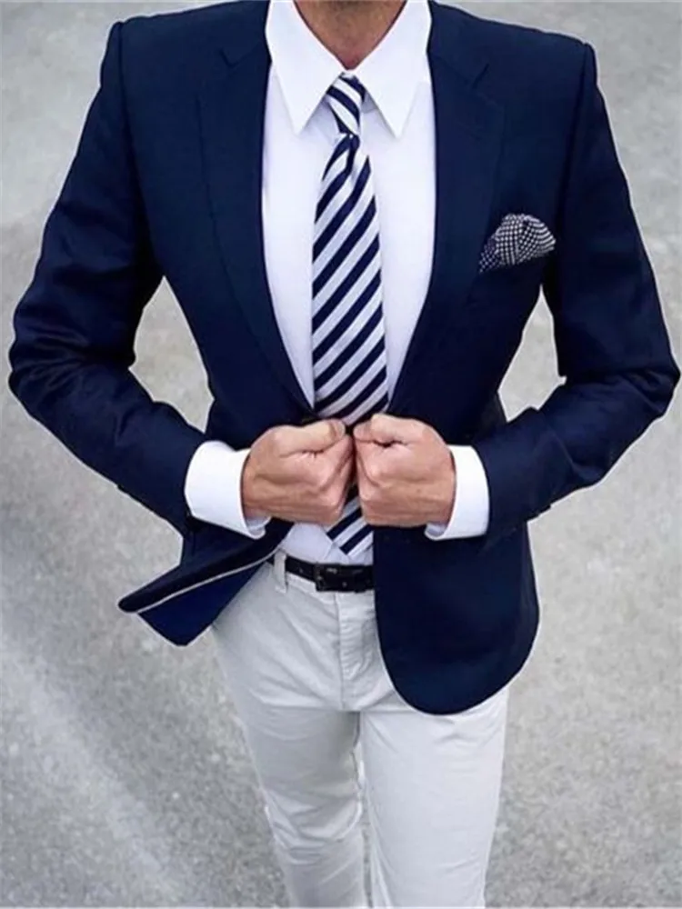 Мужские костюмы (пиджак + брюки), Новый Повседневный стиль, синие и белые смокинги для жениха, облегающие мужские костюмы для свадебной вечеринки