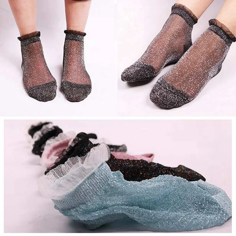 Летние блестящие носки для девочек, шелковые кружевные носки с блес...