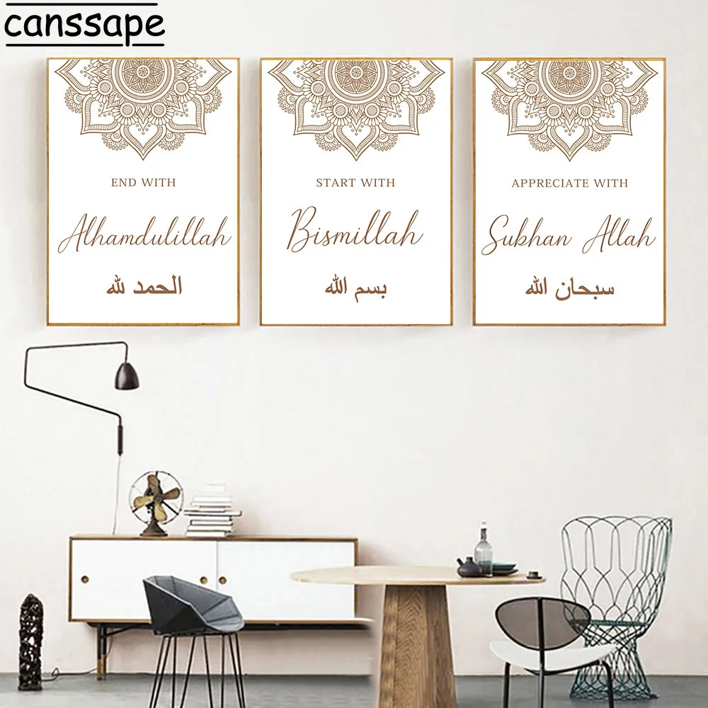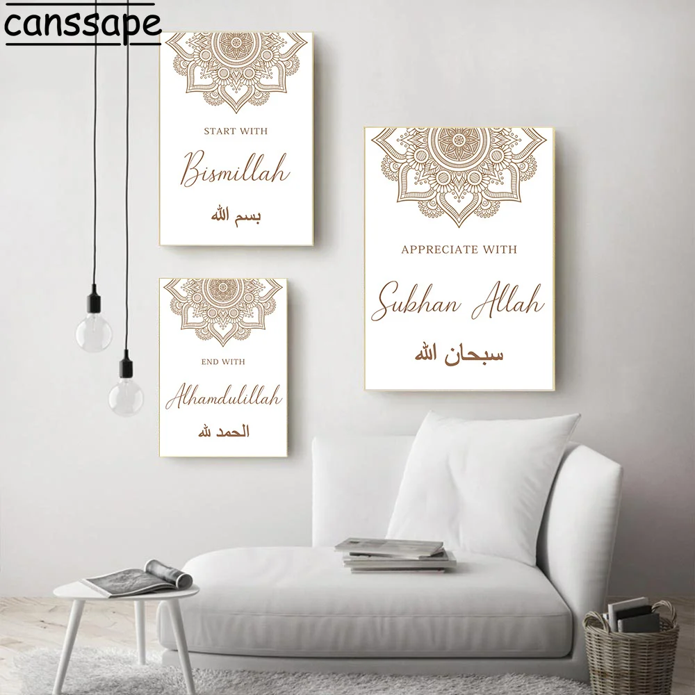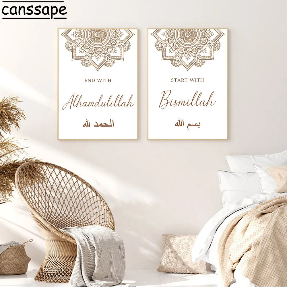 Мусульманская Настенная картина Бисмиллах, арабская каллиграфия, Постер в стиле бохо, бежевая Цветочная живопись, мусульманские настенные картины, декор для гостиной