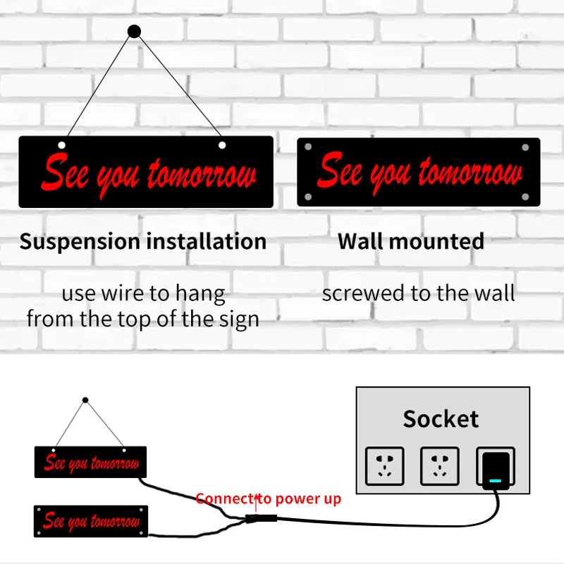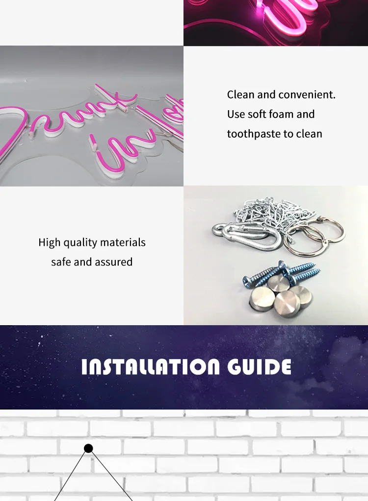 1. Мы можем сделать все неоновые знаки, которые вам нужны. Просто предоставьте содержание, цвет, размер или отправьте нам чертежи вашего дизайна и детальные требования 2. Настенный монтаж, Установка Подвески, простой и удобный Используйте провод, чтобы повесить сверху знак или прикрутить к стене 3. Стандартная вилка для любой страны Есть штепсельная вилка стандарта США, штепсельная вилка стандарта Великобритании, штепсельная вилка стандарта Австралии и штепсельная вилка европейского стандарта 4. Один год гарантии на светодиодную неоновую вывеску Наша светодиодная неоновая вывеска сделана из лучшего качества led neon flex, поэтому мы можем обещать, что наружная гарантия составляет 6 месяцев, гарантия в помещении составляет 1 год. В течение гарантийного срока, если возникнут какие-либо проблемы с качеством, мы отремонтируем или даже заменим для вас бесплатно. 5. Заводская цена Потому что мы производим в Фошань, поэтому, когда мы обеспечиваем лучшее качество продукции для вас, мы также можем дать вам самую разумную цену. 6. Короткое производство и время доставки У нас есть более 100 рабочих фабрик, и долгосрочные отношения с транспортной компанией. Поэтому мы можем обещать вам короткое производство и время доставки. Обычно это занимает 4-5 рабочих дней для производства, экспресс-доставка около 30-90 дней, коммерческий Экспресс-Доставка 5-7 дней