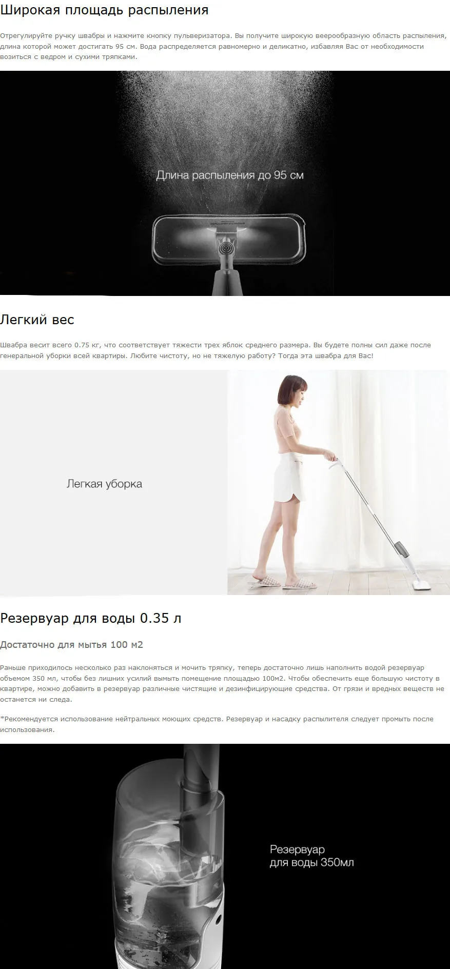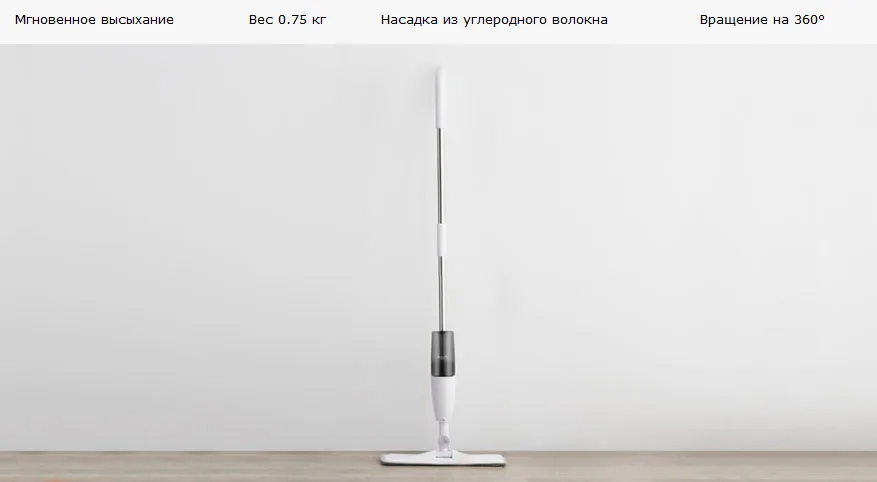 Управление: механическая системаРазмер рабочей части: 35 х 12смВстроенный пульверизаторРезервуар для воды: 350млПлощадь уборки на 1 заливке резервуара: 100м²Длина распыления: до 95 смНаклонно-поворотный кронштейн, обеспечивающий простой доступ в любые углыДва режима распыления: для ламината и других напольных покрытийМатериал: пластик, металлМатериал насадки: углеродное волокноТелескопическая штанга: 1,2 мРазмер: 124х35,5 смВес: 0,75 кг