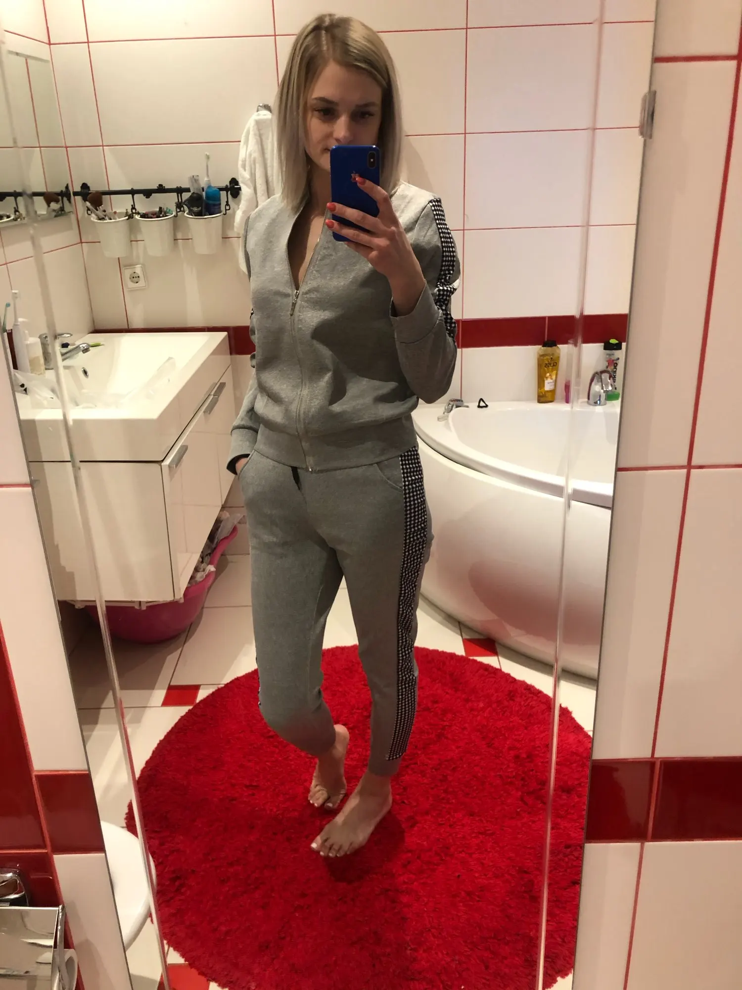Костюм классный, размер подошёл, можно конечно было взять на размер поменьше, но тогда кофта не сошлась бы на талии. Кое где торчат нитки, но это не влияет на качество, запаха нету. Взяла размер М, при росте 1,74 и весе 56кг. Спасибо продавцу. Буду заказывать у него еще :)