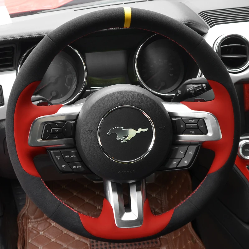 Черный замшевый кожаный чехол на руль с красной строчкой, подходит для Ford Mustang 2015-2019 / Mustang GT 2015-2019