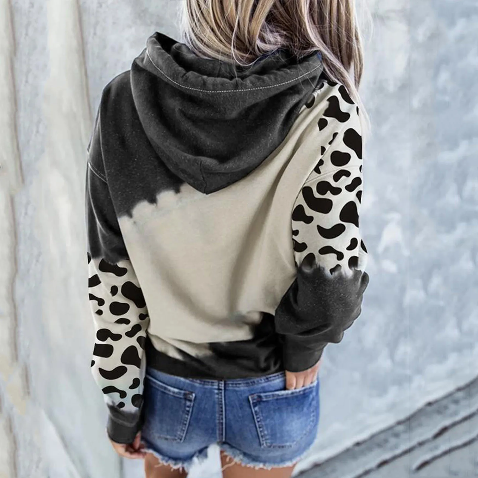 Женская одежда 2020, женский осенний костюм, модная Женская толстовка с длинным рукавом и принтом в стиле колор блок, с коровьим принтом и карманами, топ с капюшоном