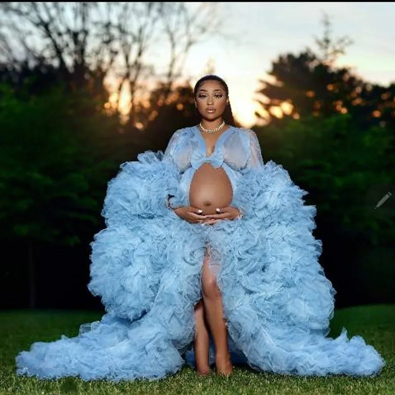 Очень пышная небесно-голубого цвета, тюль, платья для будущих мам, 2021 свадебное платье многоуровневые оборки фатиновые платья для выпускного вечера одежда с длинным рукавом Baby Shower платья Vestido
