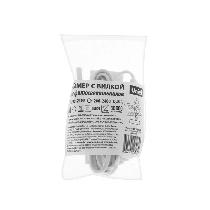 Таймер с вилкой Uniel, 220 В, 150 Вт, разъем LNG, для фитосветильника, провод 2 м 4825651