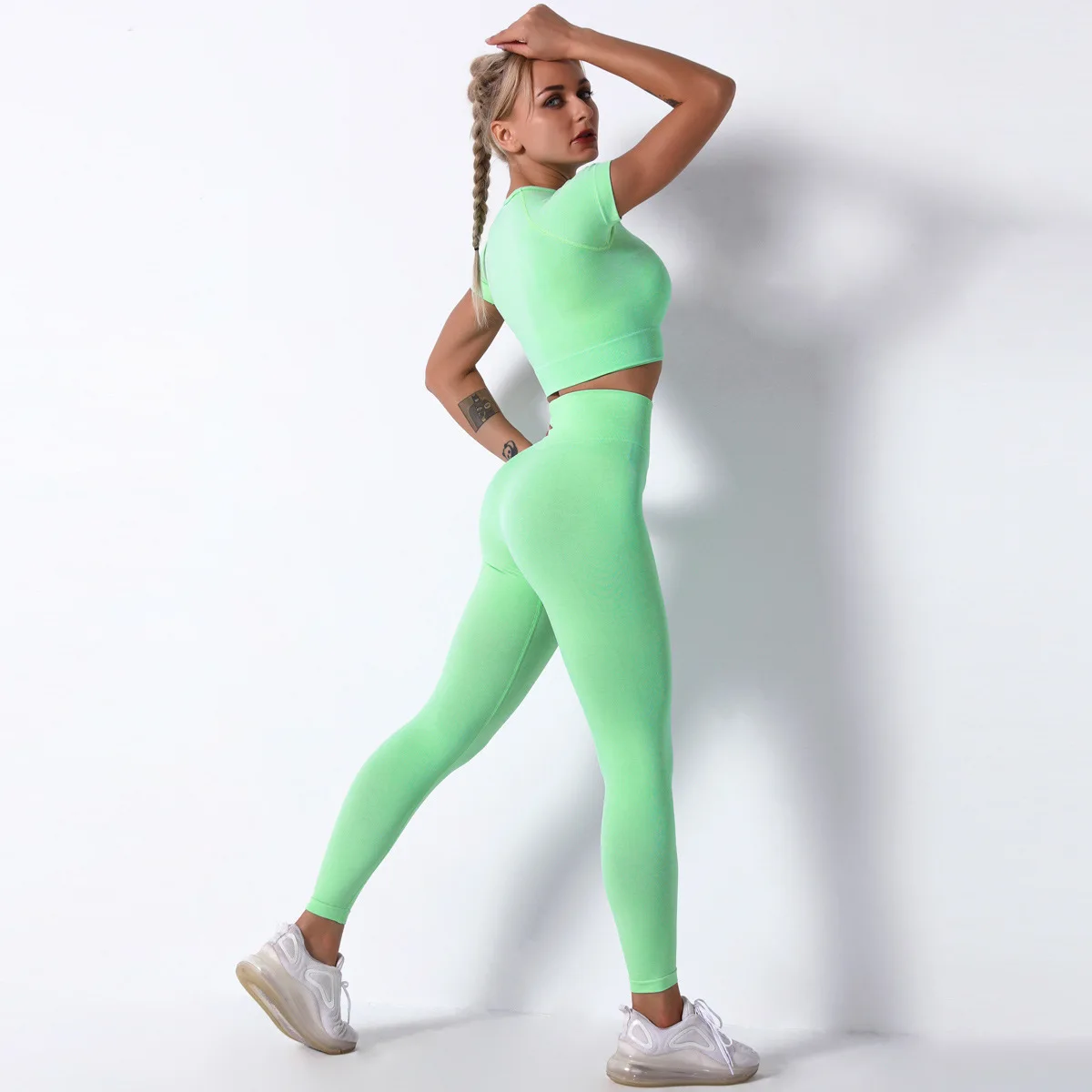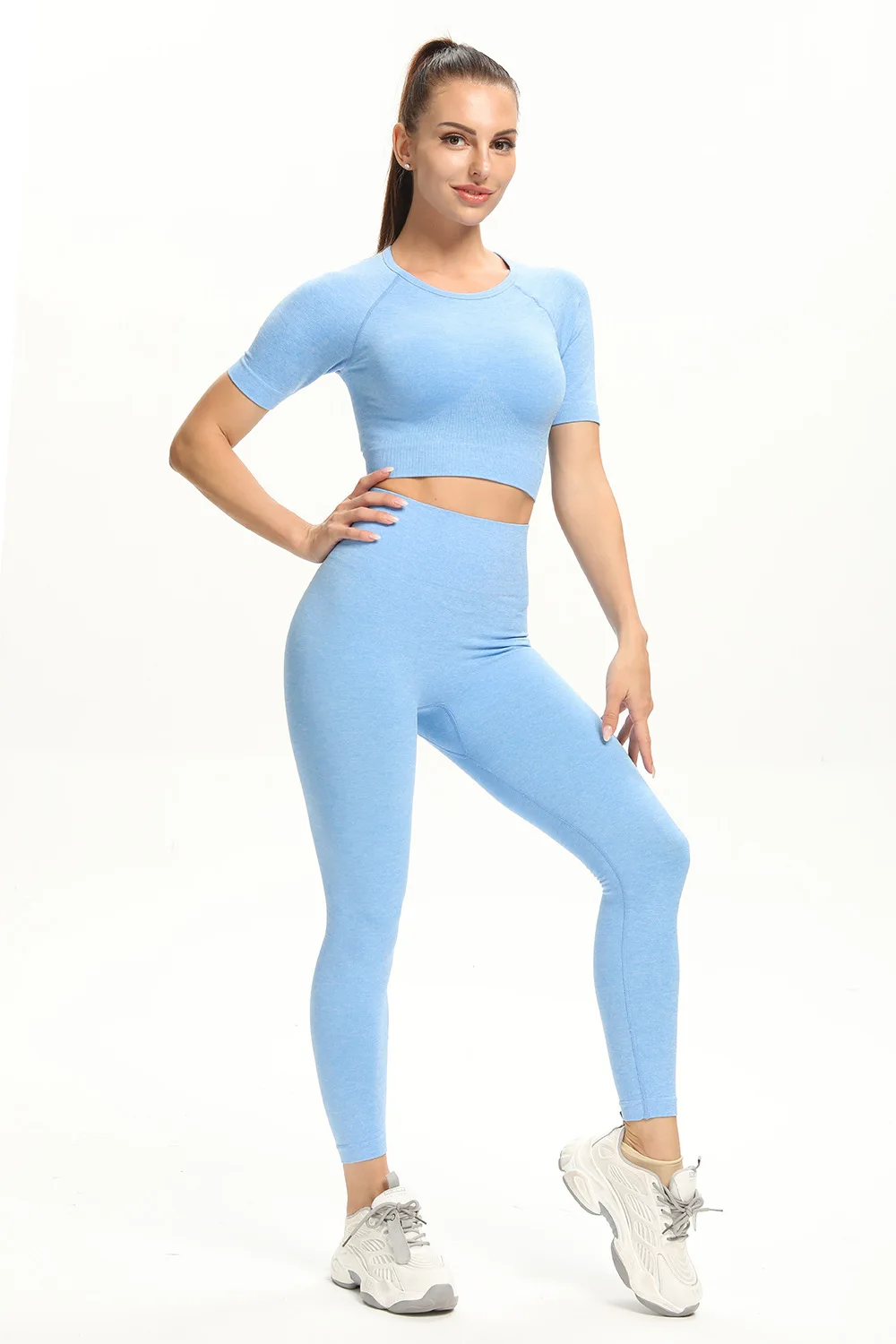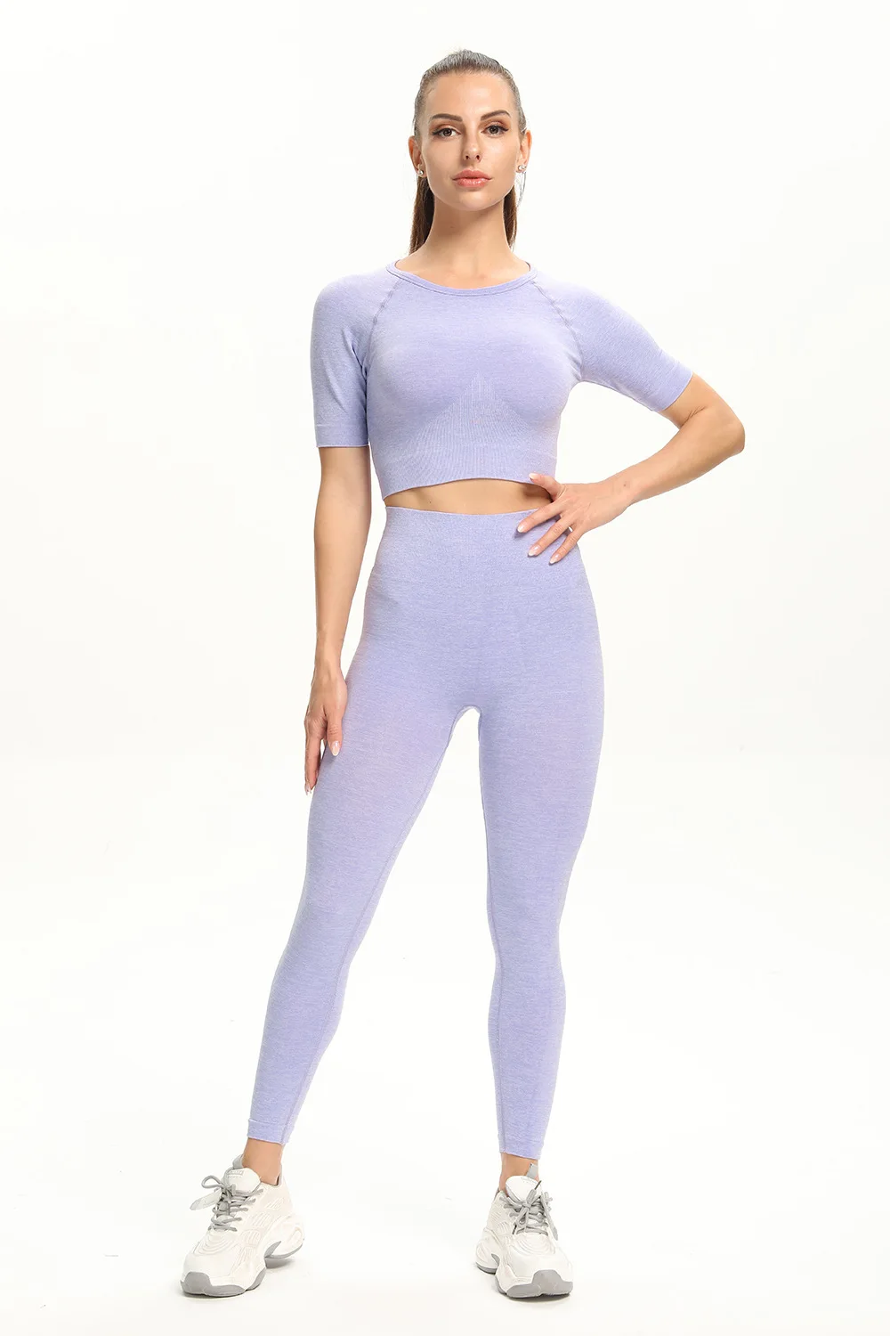Однотонный топ бесшовные леггинсы для спорта, фитнеса, одежда для активных движений, комплекты из 2 предметов; Футболка с короткими рукавами в рубчик брюки для йоги и танцев стрейч с высокой талией, сиреневый