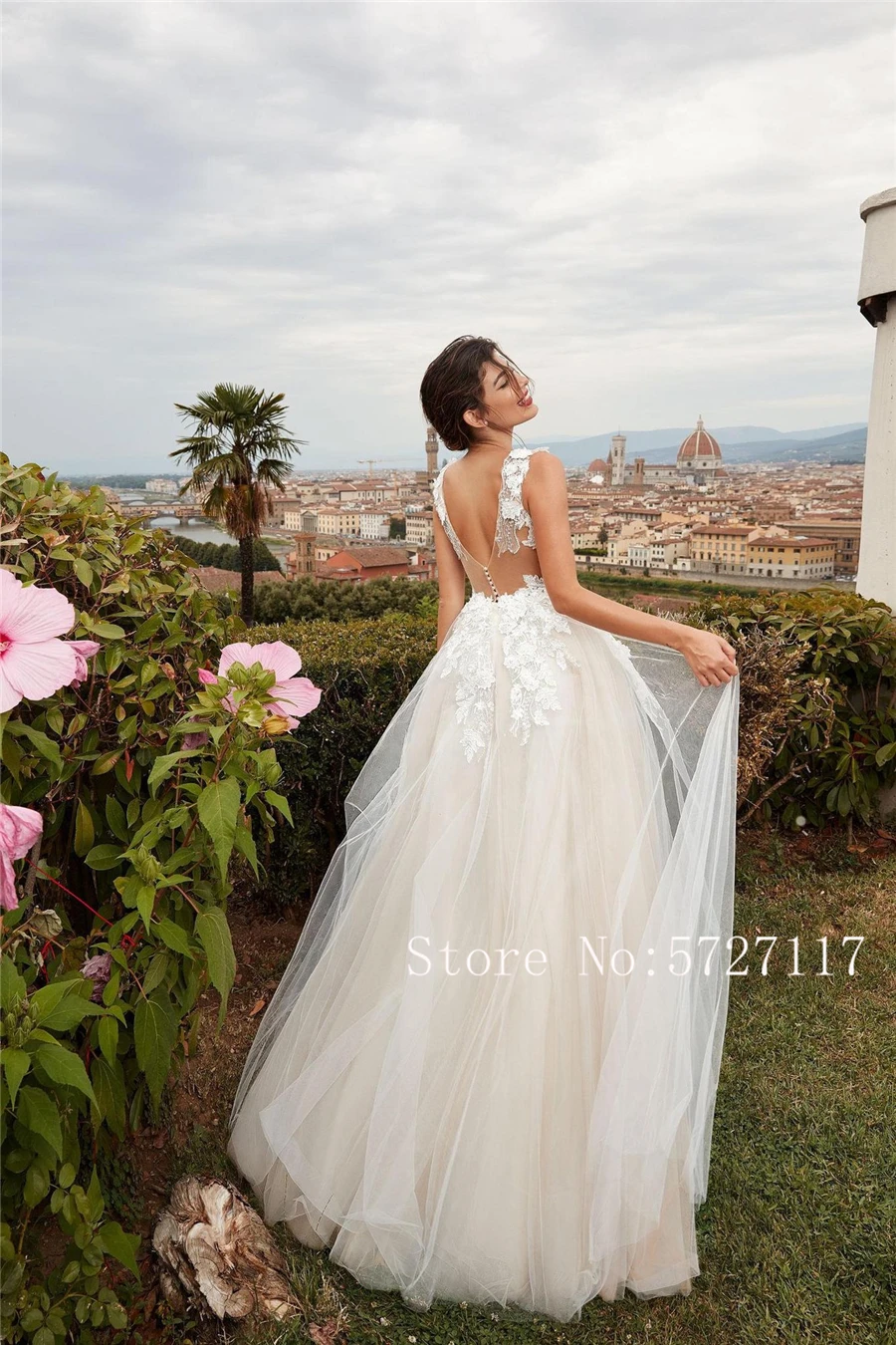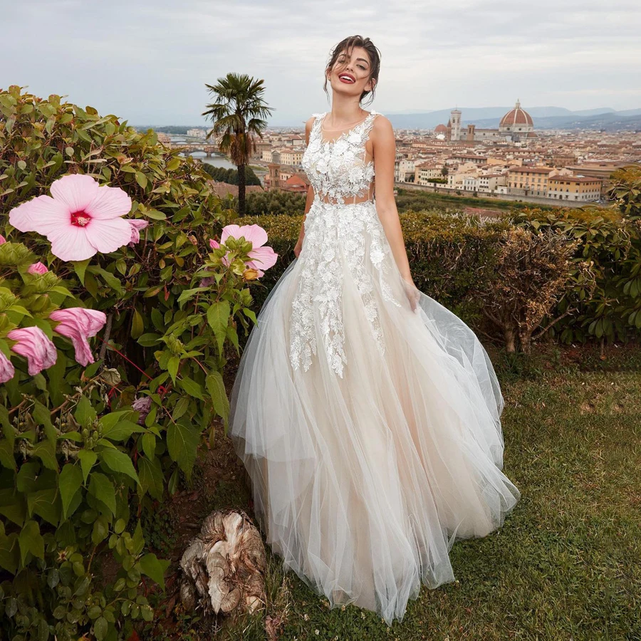 Кружевное свадебное платье цвета шампанского с круглым вырезом, а-силуэт, с 3D аппликацией, просвечивающее платье невесты с вырезом