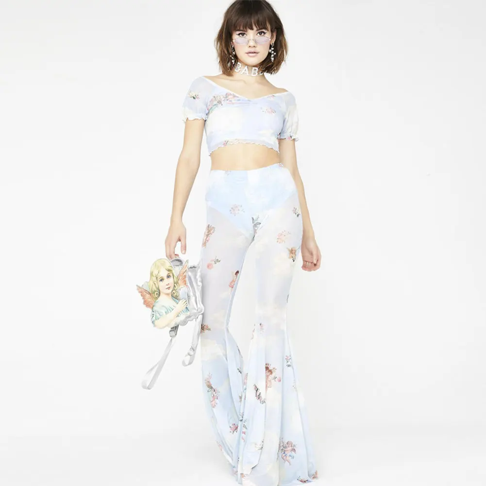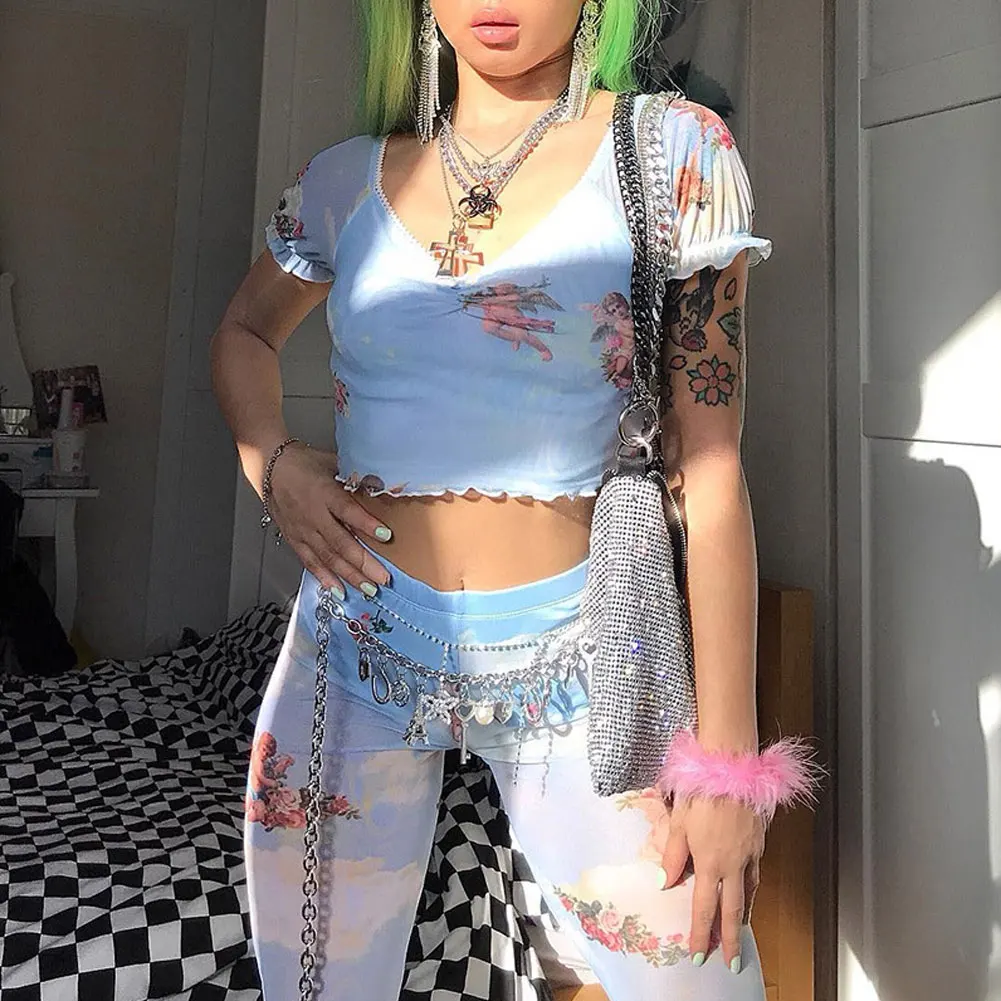 Летние женские прозрачные укороченные топы для девушек в винтажном стиле сетчатые прозрачные футболка с коротким рукавом с принтом ангела v-образный вырез безрукавка пляжные футболки для девочек