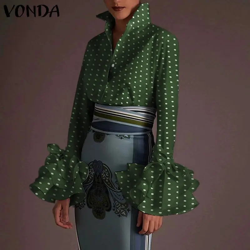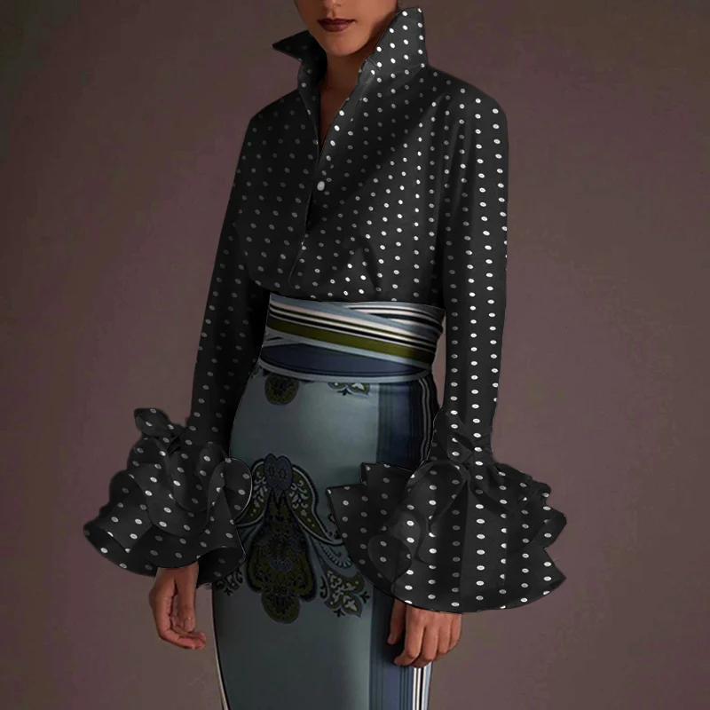 Рубашка женская с воротником с лацканами, на пуговицах, повседневный Топ в горошек, элегантная офисная блузка с пышными рукавами, с длинным рукавом, осень 2021
