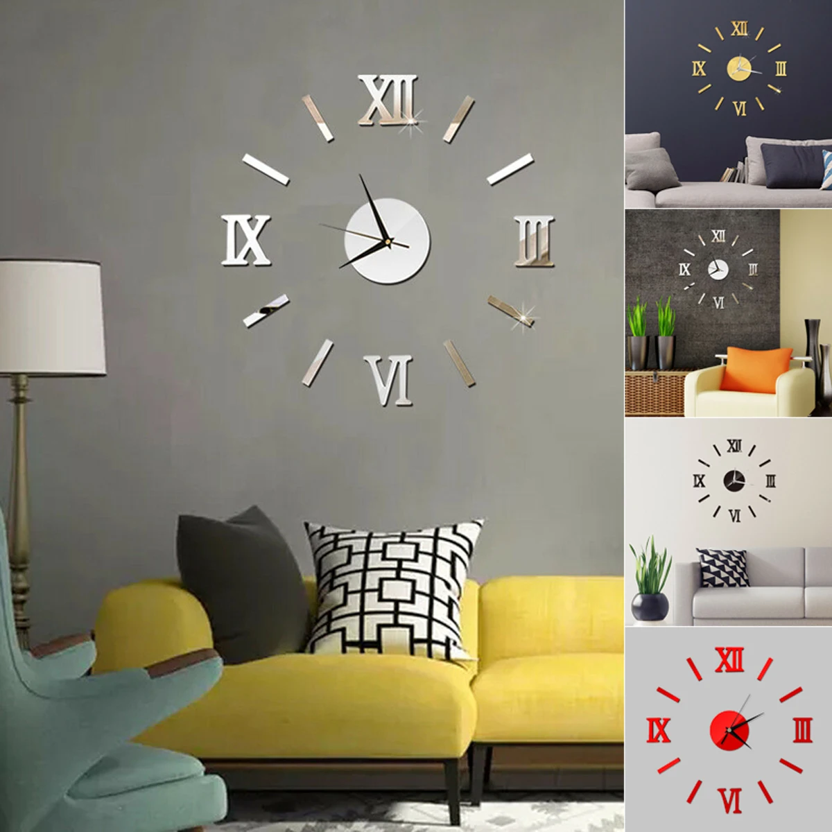 3D зеркальные римские цифры настенные часы наклейки Элегантные DIY ...