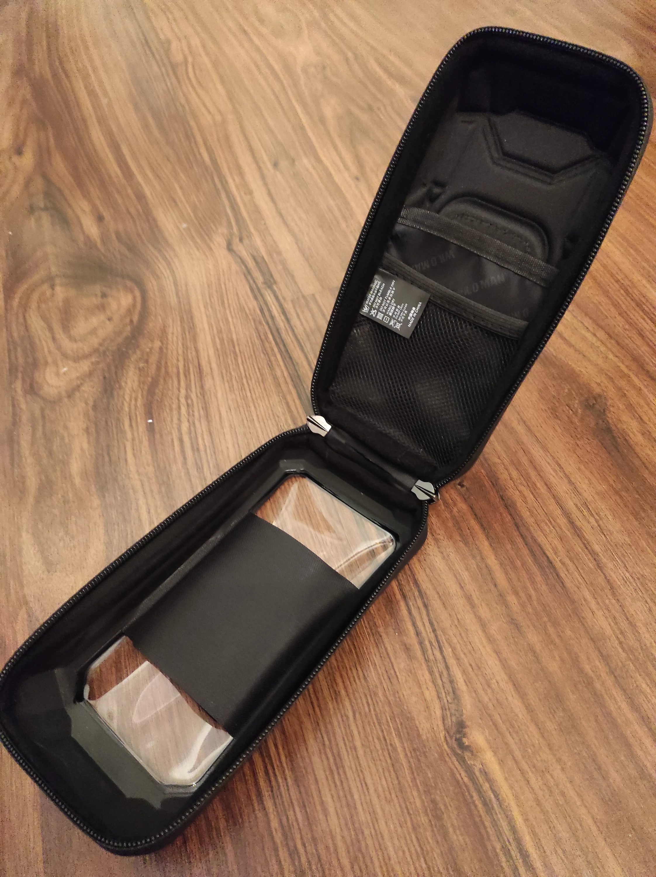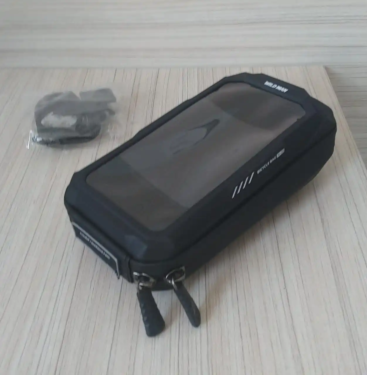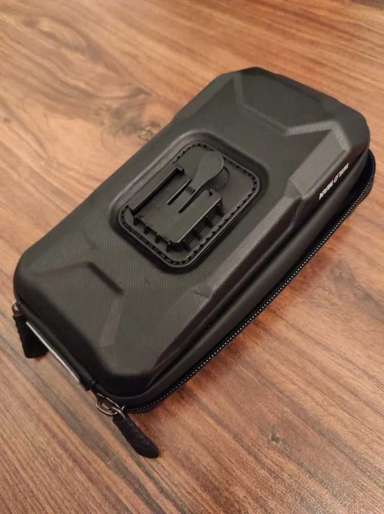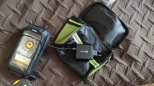 Доставка очень быстрая, меньше двух недель. Трек отслеживался, уведомления приходили. Упакован хорошо. Полностью соответствует описанию. Телефон с диагональю 6,67 влезает, сенсор работает хорошо. Остается еще место для powerbank и мелочевки. В комплекте два крепления, одно чуть короче второго.