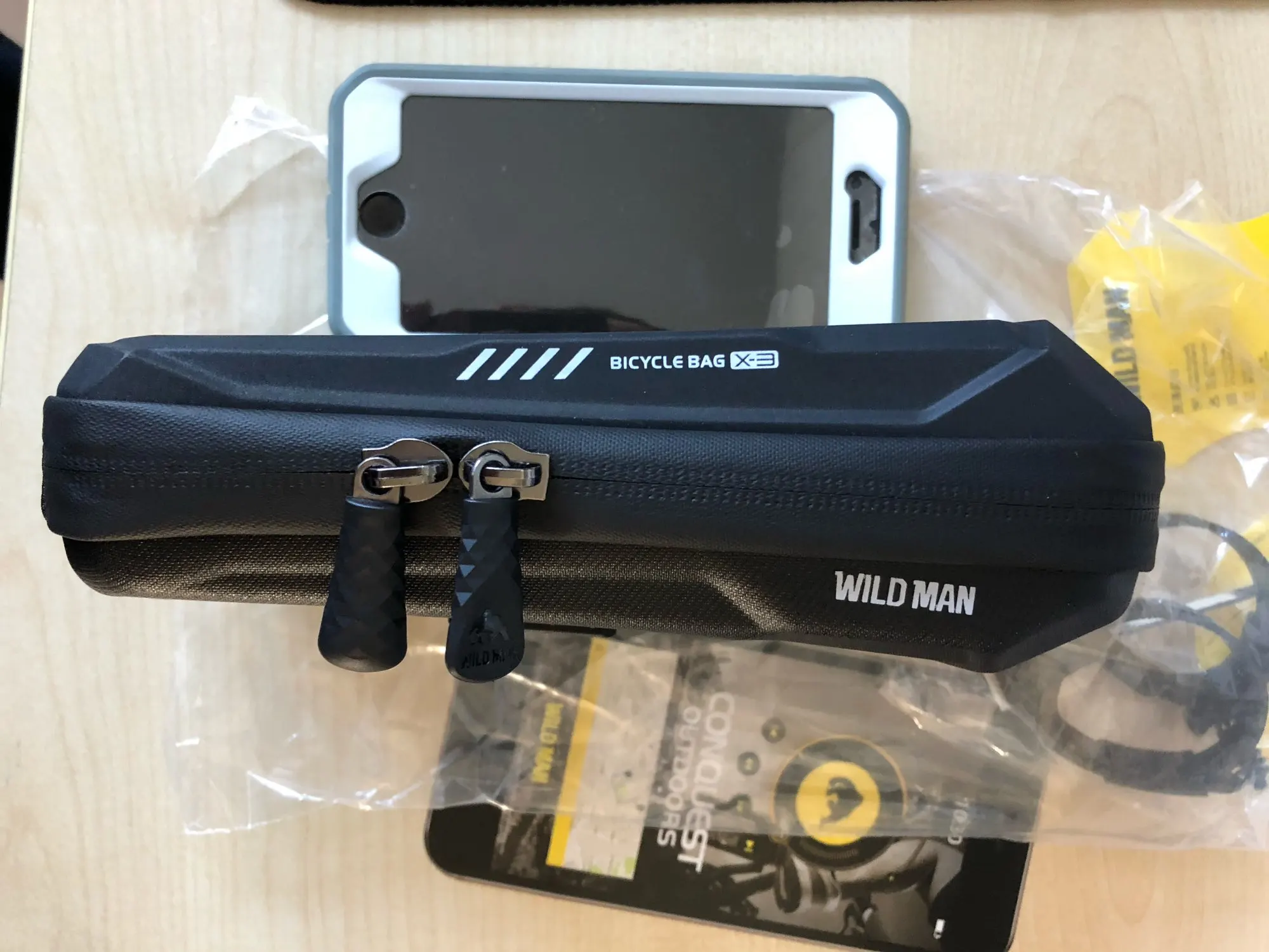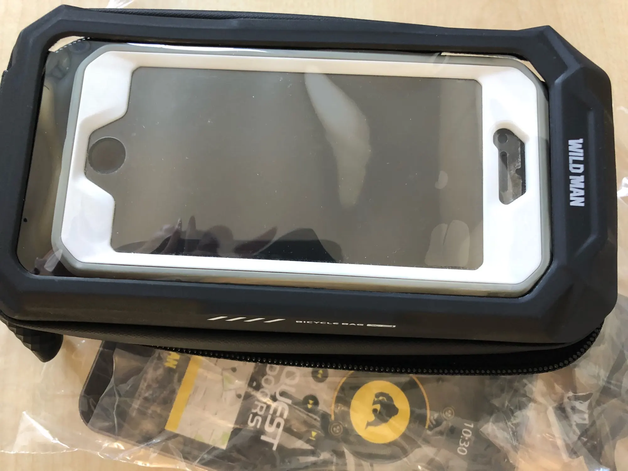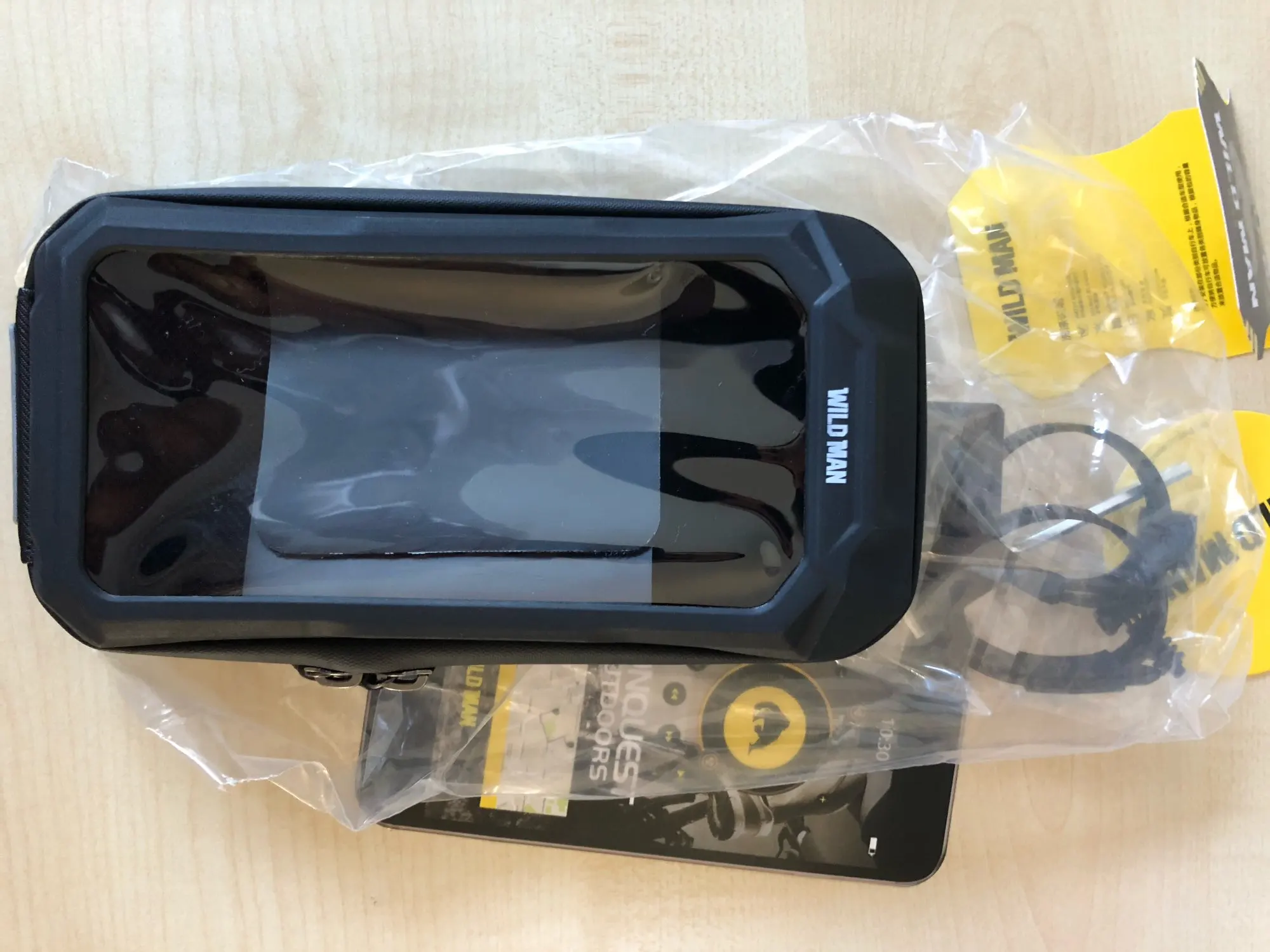 Доставка очень быстрая, меньше двух недель. Трек отслеживался, уведомления приходили. Упакован хорошо. Полностью соответствует описанию. Телефон с диагональю 6,67 влезает, сенсор работает хорошо. Остается еще место для powerbank и мелочевки. В комплекте два крепления, одно чуть короче второго.