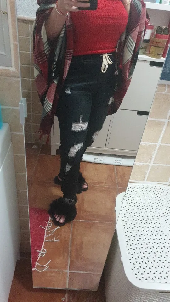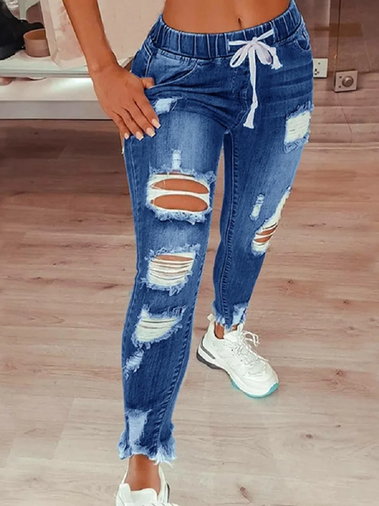 Женские джинсы-карандаш, Стрейчевые длинные рваные джинсы со шнурком, размера плюс