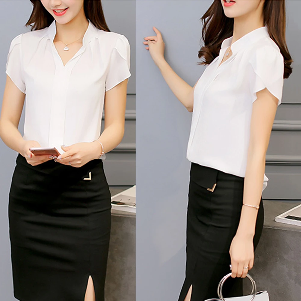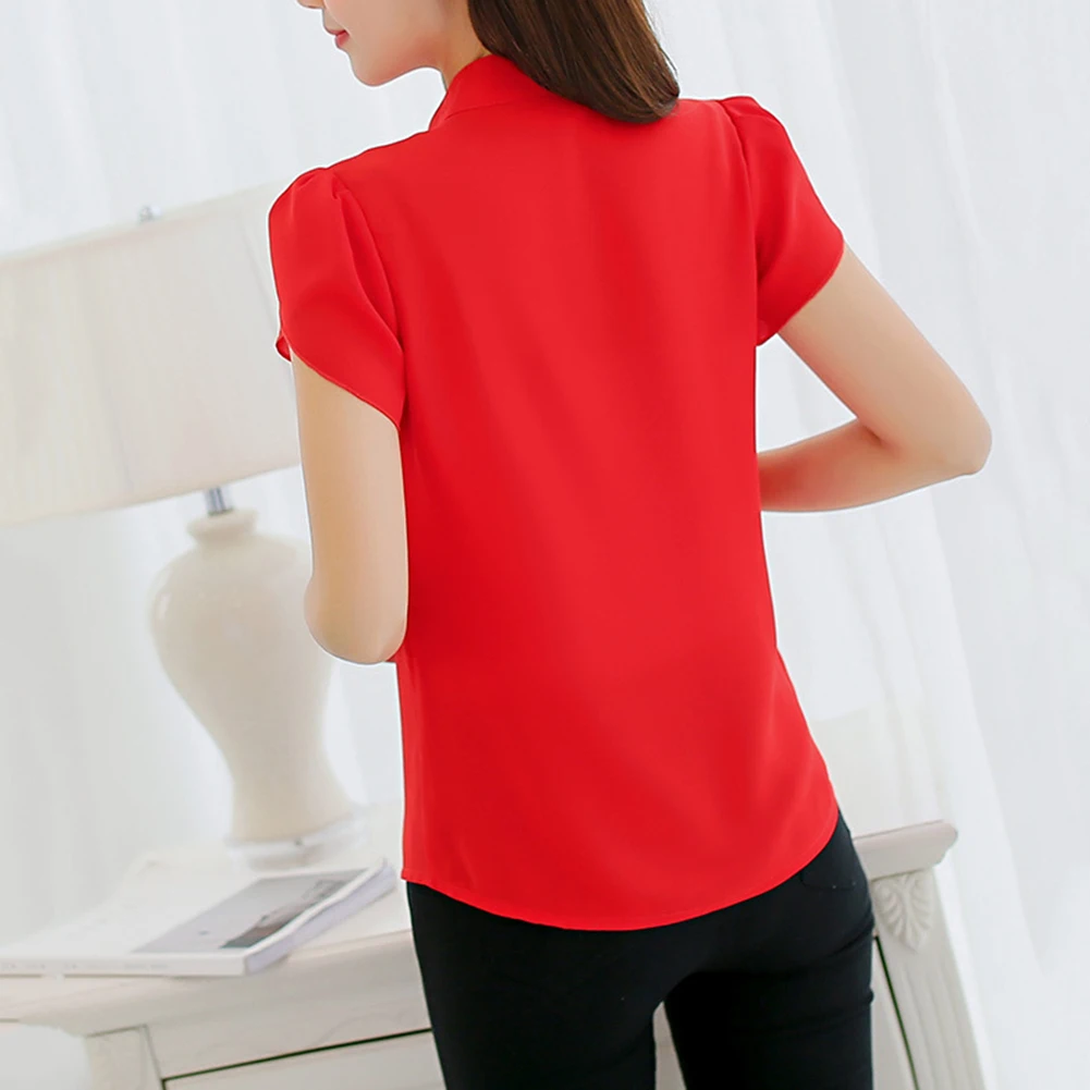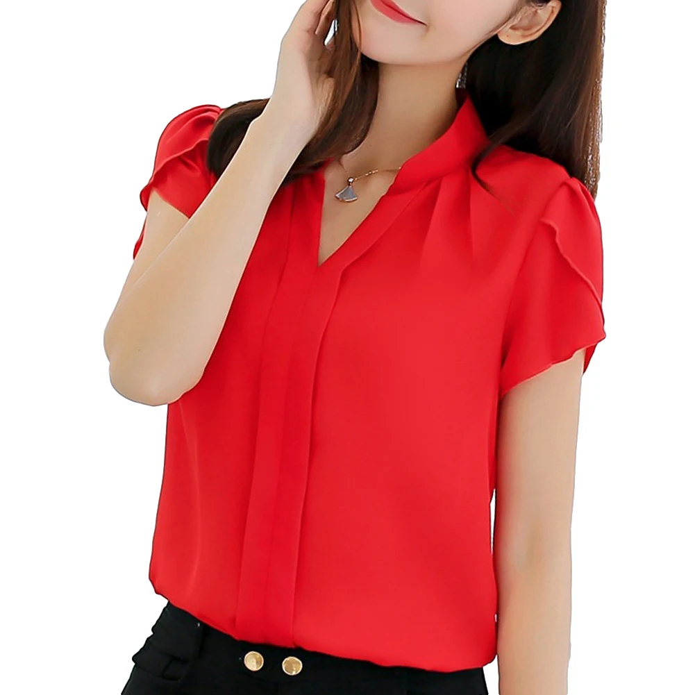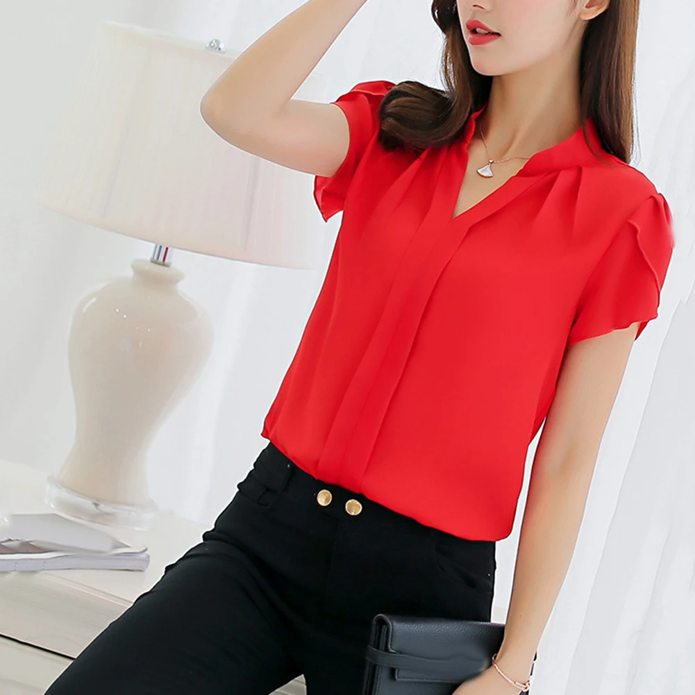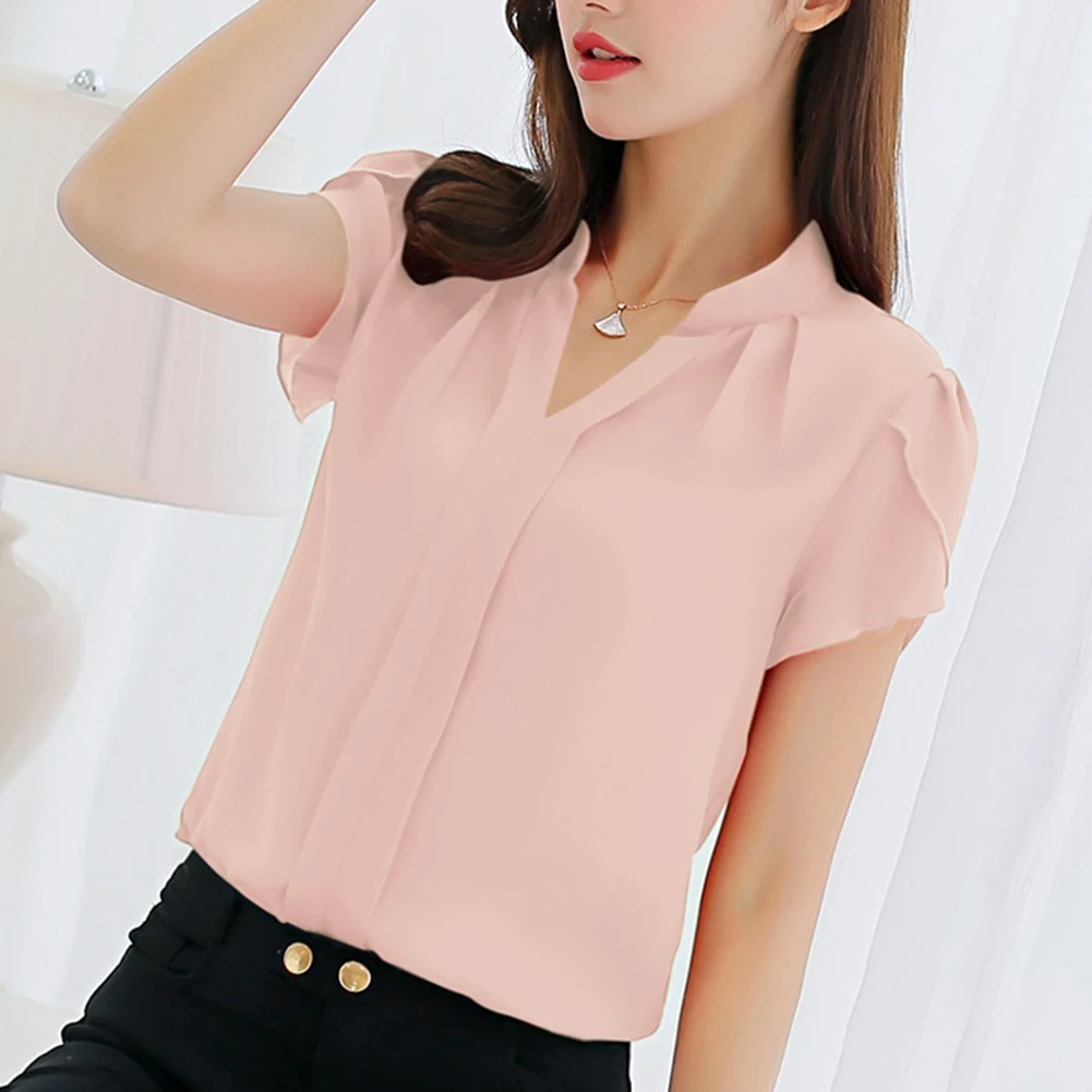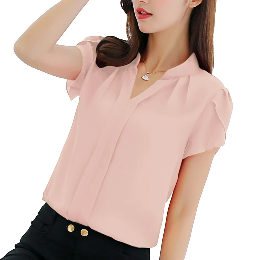 Новинка лета 2020, Женский Топ с коротким рукавом, модная шифоновая однотонная женская рубашка с V-образным вырезом, шифоновая женская блузка