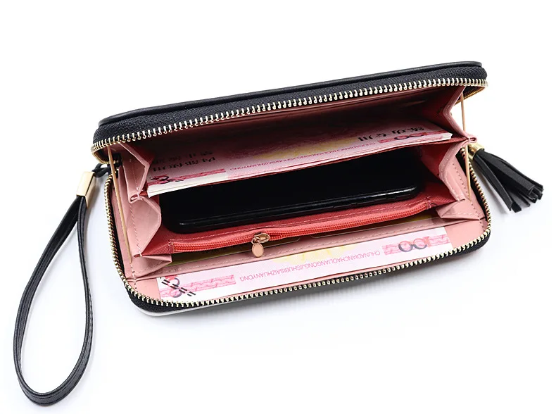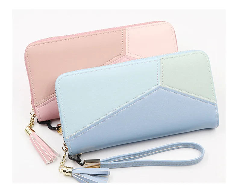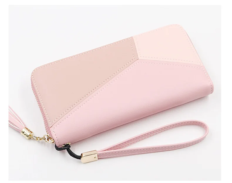 Женский Длинный кошелек из искусственной кожи с геометрическим рисунком контрастных цветов, модный Дамский кошелек с кисточками, кошелек на молнии, вместительный кошелек, держатель для карт, 2020