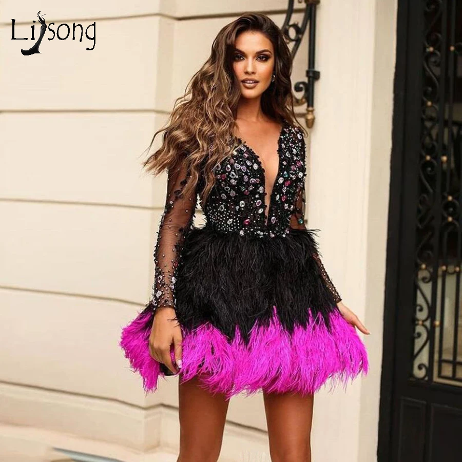 Роскошные Короткие коктейльные платья с перьями, блестящее цветное мини-платье с кристаллами и бусинами для официального мероприятия, вечерние, платья с длинными рукавами