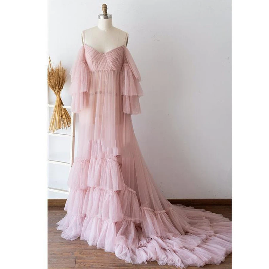 Милое, розовое платье в сетку, видеть сквозь тюль выпускное платье с оборками многослойное платье трапециевидной формы платья для выпускного бала пышные Длинные рукава Для женщин длинный халат размера плюс