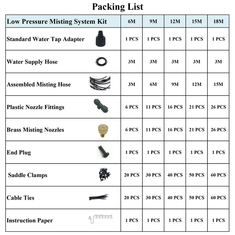 Комплект 6 м (черный или белый): ※ Латунное сопло: 6 шт ※ Держатель насадок: 6 шт ※ Концевая заглушка: 1 шт. ※ Полиэтиленовая трубка: 6 м ※ Адаптер 3/4 ": 1 шт. ※ Переходник для смесителя: 1 шт. ※ Зажим трубки: 20 шт. ※ Галстук с трубкой: 20 шт. Комплект 9 м (черный или белый): ※ Латунное сопло: 11 шт ※ Держатель насадок: 11 шт ※ Концевая заглушка: 1 шт. ※ Полиэтиленовая трубка: 9 м ※ Адаптер 3/4 ": 1 шт. ※ Переходник для смесителя: 1 шт. ※ Зажим трубки: 30 шт ※ Галстук с трубкой: 30 шт. Комплект 12 м (черный или белый): ※ Латунное сопло: 16 шт ※ Держатель насадок: 16 шт ※ Концевая заглушка: 1 шт. ※ Полиэтиленовая трубка: 12 м ※ Адаптер 3/4 ": 1 шт. ※ Переходник для смесителя: 1 шт. ※ Зажим трубки: 40 шт. ※ Галстук с трубкой: 40 шт. 15 м комплект (черный или белый): ※ Латунное сопло: 21 шт ※ Держатель насадок: 21 шт ※ Концевая заглушка: 1 шт. ※ Полиэтиленовая трубка: 15 м ※ Адаптер 3/4 ": 1 шт. ※ Переходник для смесителя: 1 шт. ※ Зажим трубки: 50 шт. ※ Галстук с трубкой: 50 шт. Комплект 18 м (черный или белый): ※ Латунное сопло: 26 шт. ※ Держатель насадок: 26 шт ※ Концевая заглушка: 1 шт. ※ Полиэтиленовая трубка: 18 м ※ Адаптер 3/4 ": 1 шт. ※ Переходник для смесителя: 1 шт. ※ Зажим трубки: 60 шт. ※ Галстук с трубкой: 60 шт.