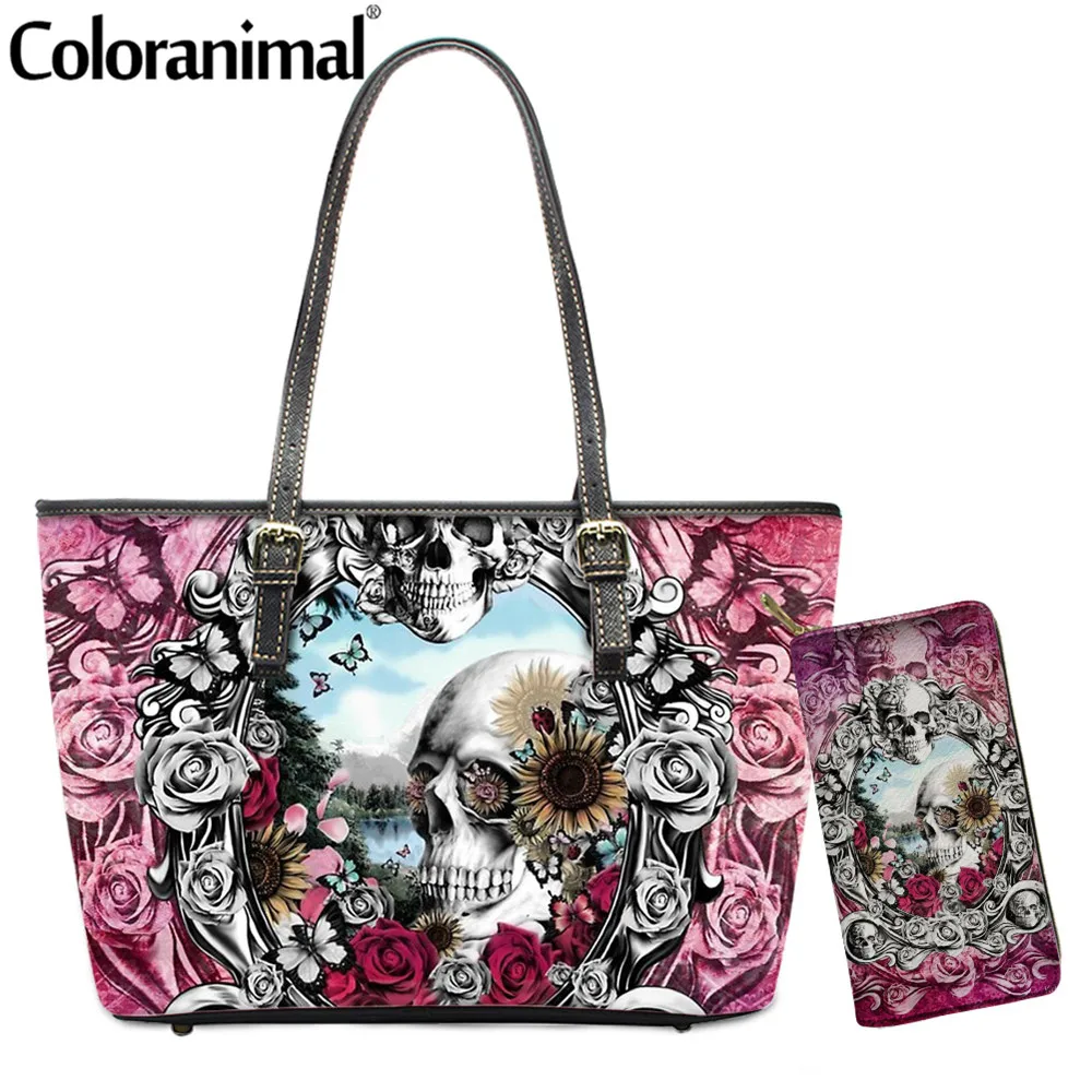 Coloranimal красивое зеркало череп в фон с изображением роз на женская сумка через плечо из искусственной кожи 2 шт.компл. сумка кошелек Для женщин Сумка Bolso