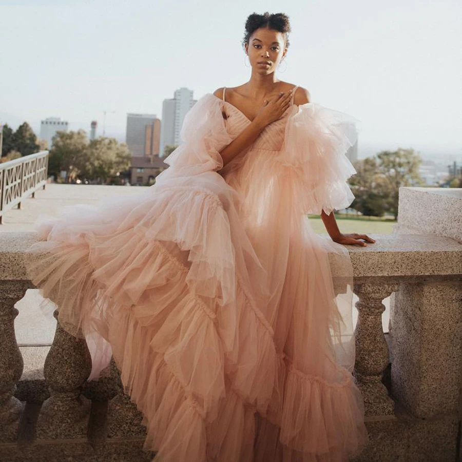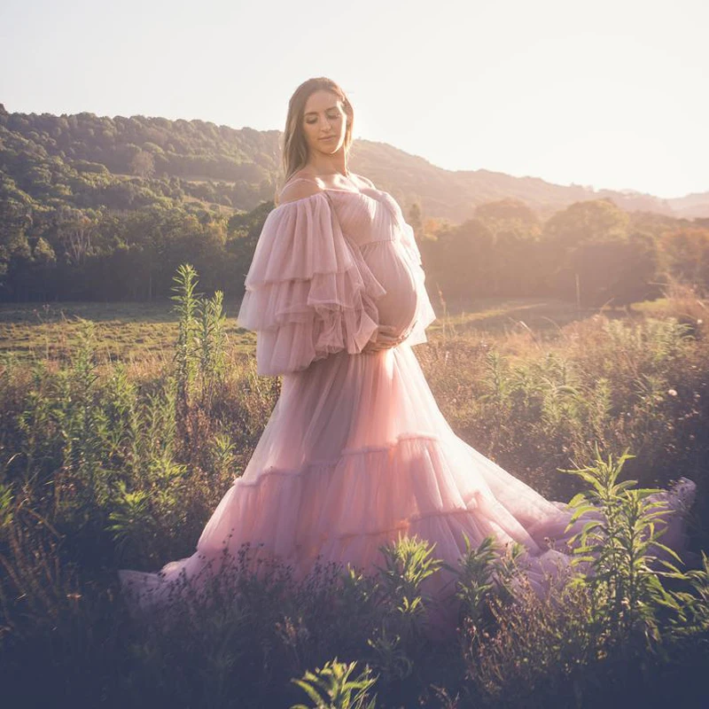 Красивые розовые тюлевые Длинные платья для беременных с пышными ру...