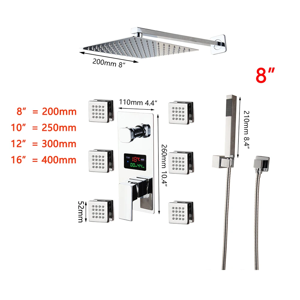 Светодиодный смеситель для ванной комнаты Monite 8 16 дюймов, квадратный хромированный латунный наконечник сообщений, цифровой дисплей, набор для душа