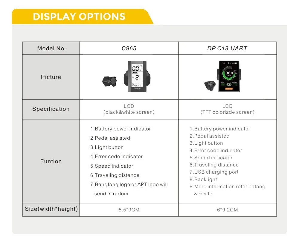 Спецификация двигателя:Модель двигателя: BBSHD / BBS03BМодель Bafang: G320.1000Мощность: 1000 ВтНапряжение контроллера: 48 В / 52 ВТок контроллера: 28АСкорость холостого хода (об / мин): 160Скорость нагрузки (об / мин): 140-150МАКСИМАЛЬНЫЙ крутящий момент: 160 НмМаксимальная скорость: 60 км / чЭффективность:> 80%PAS SENSOR: Датчик скоростиПередаточное отношение: 1: 21,9Сертификация: CE / EN 14764 / ROHSВодонепроницаемый класс: IP65Рабочая температура двигателя: -20 ℃ -45 ℃Рабочая температура дисплея: -20 ℃ -80 ℃Водонепроницаемый класс: IP65