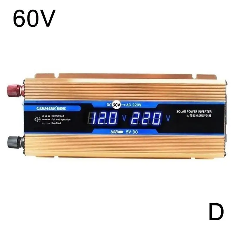 Характеристики:-Версия: от 12 В до 220 В, от 24 В до 220 В, от 48 В до 220 В, от 60 в до 220 В-Цвет: золото-Д * Ш * В: 17*10*5 см-Материал: алюминиевый сплав-Пиковая мощность: 2000 Вт-Непрерывная мощность: 1000 Вт-Цифровой дисплей: Входное/выходное напряжение-Входное напряжение: DC 12V/ 24V/ 48V/ 60V-Выходное напряжение: AC 220V-Эффективность преобразования: более 90%-Форма волны: Модифицированная синусоида-Область применения: бытовые электроприборы и др.Особенности:-Противоударная функция-Функция защиты от перенапряжения-Функция защиты от перегрузки-Функция защиты от перегрузки по току-Функция защиты от перегрева-Функция защиты от короткого замыкания-Функция отображения входного/выходного напряжения-Сохранить ваши устройства и автомобиль в безопасности-Встроенный вентилятор охлаждения для срока службы и безопасного использования-Умный размер светильник и совместимость, меньший уровень шума и отсутствие загрязнений-Идеально подходит для питания смартфонов, ноутбуков, планшетов, GPS-устройств, телевизоров, зарядных устройств, DVD-плееров, MP3-плееров, кемпинговой техники и мобильной офисной техники, полевого освещения и т. Д.Посылка входит:-1 солнечный инвертор-1 пара кабель с зажимом-1 руководство пользователя на английском языке