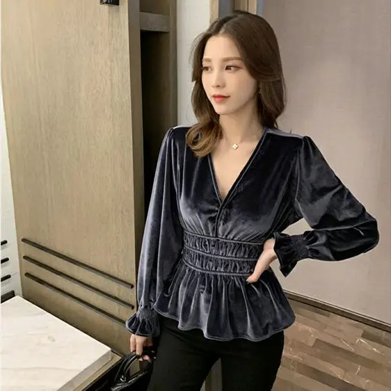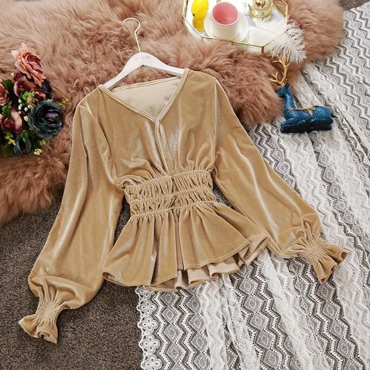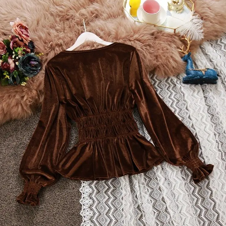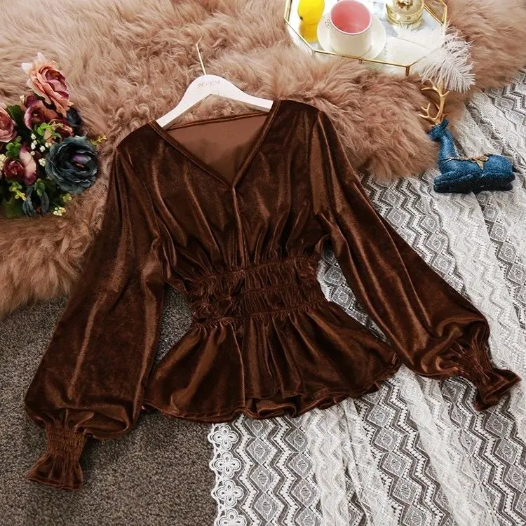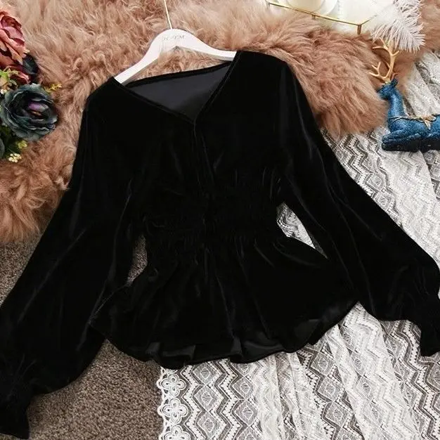 Блузка женская с оборками и длинным рукавом, свободная рубашка с V-образным вырезом, бархатный топ, одежда