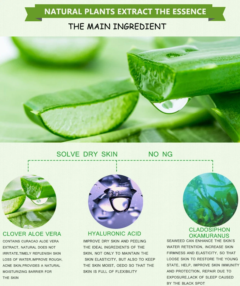 ▶Основной ингредиент решает сухость кожи 1. Клевер алоэ вера Содержит экстракт Кюрасао алоэ вера, натуральный, не раздражает, своевременно восстанавливает потерю кожи, улучшает шероховатость, акне, обеспечивает естественный увлажняющий барьер для кожи. 2. Гиалуроновая кислота Улучшает сухость кожи и пилинг идеальных ингредиентов кожи, не только для поддержания упругости кожи, но и для сохранения увлажнения кожи, OEDO, так что кожа полна гибкости. 3. Кладосифон окамуранус Морские водоросли могут усилить удержание воды в коже, повысить упругость и эластичность кожи, так что свободное состояние кожи, помогает, улучшает иммунитет и защиту кожи, восстанавливает воздействие, отсутствие сна, вызванное черным пятном.