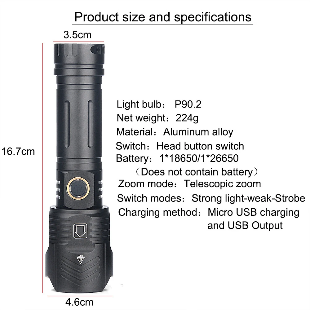 Вход и выход, дисплей питания 1. P90 лампы, высокая яркость до 3500 люменов, срок службы 100000 часов; 2. Выпуклая линза: Орлиный глаз выпуклая линза, хорошая светильник производительность передачи, не легко повреждается, сильная алюминиевая головная часть для защиты объектива от износа 3. Телескопический зум: растяните голову влево и вправо, чтобы увеличить, режим астигматизма-концентрации, удобный для использования в различных ситуациях; 4. Средний переключатель: высококачественный натуральный каучук материал, нескользящая поверхностная обработка, светильник сенсорный переключатель для включения светильник ing для переключения режима переключения 5. Контакт батареи: контактная конструкция батареи имеет хорошую электропроводность и эффективно предотвращает плохой контакт.
