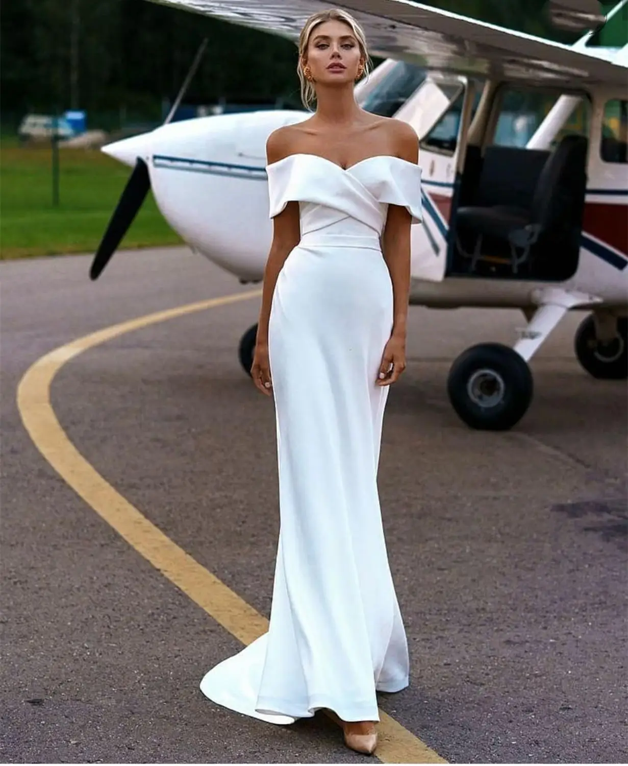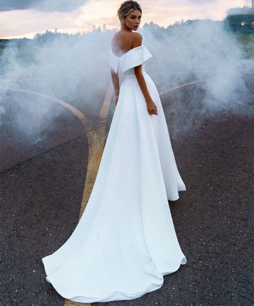 Платье свадебное атласное с открытыми плечами, ТРАПЕЦИЕВИДНОЕ ПЛАТЬЕ С Коротким Рукавом, со шлейфом, длиной до пола, съемное