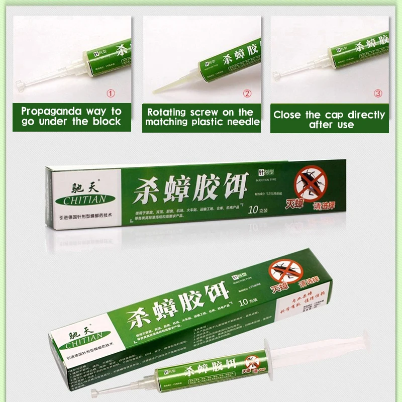 First,you should to unscrew the lid of paste body.Then put the bait into the place appliances bit by bit where cockroaches showed up.